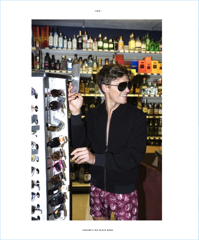 PinOliver Cheshire joins his girlfriend Pixie Lott for Esquire’s The Big Black Book. The British model wears a cardigan, sweatshirt, and shorts by Abercrombie & Fitch.