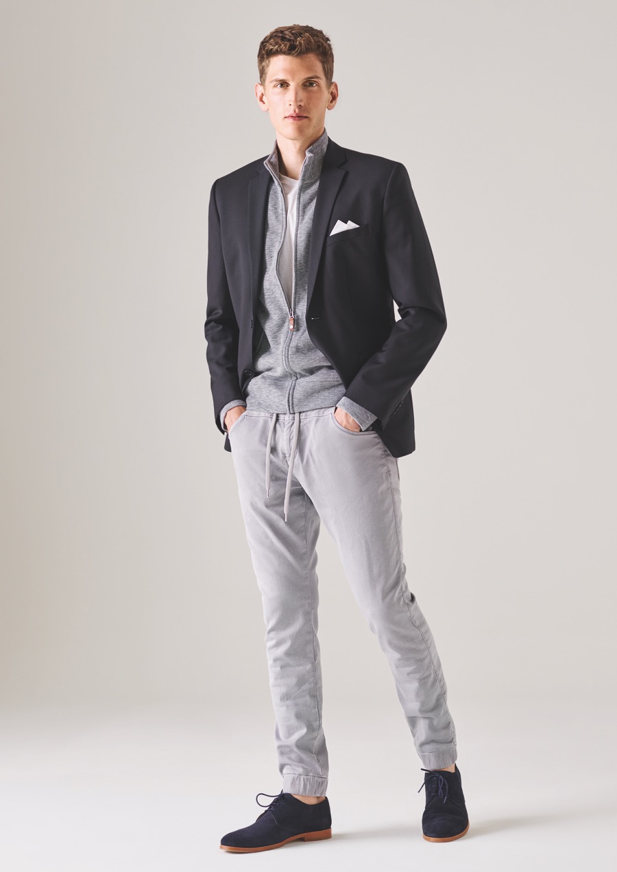 Andre Feulner sports MAC Jeans’ Jog’n Jeans with a track jacket and smart blazer.