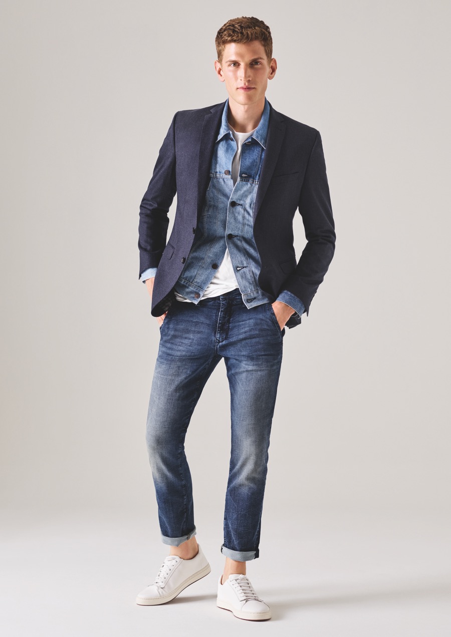 Andre Feulner classes up MAC Jeans denim with a timeless sports jacket in navy.