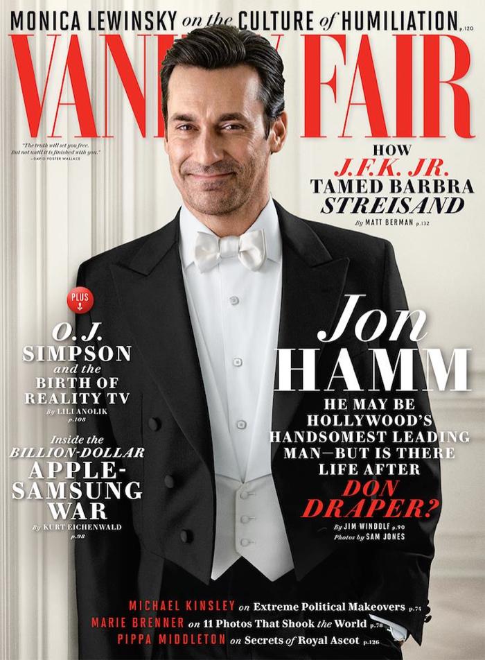 Is There Life After Don Draper for Jon Hamm? Following his cover story for Men’s Fitness, Mad Men actor Jon Hamm covers the June issue of Vanity Fair with a photo taken by Sam Jones. Fittingly, following the white tie Met Gala co-sponsored by Vogue editor-in-chief Anna Wintour and actress Sarah Jessica Parker, Hamm covers the magazine’s June issue in a luxe tuxedo. Talking to Vanity Fair about playing Mad Men’s Don Draper, Hamm shares, “This is the best job I’ve ever had and maybe ever will have in my life—it’s so fun to play all of this. It can be relentlessly dark. It can be terribly sexually inappropriate, is a way to say it. But who else gets a chance to do any of that stuff? There’s so much there.” Read more at VanityFair.com.