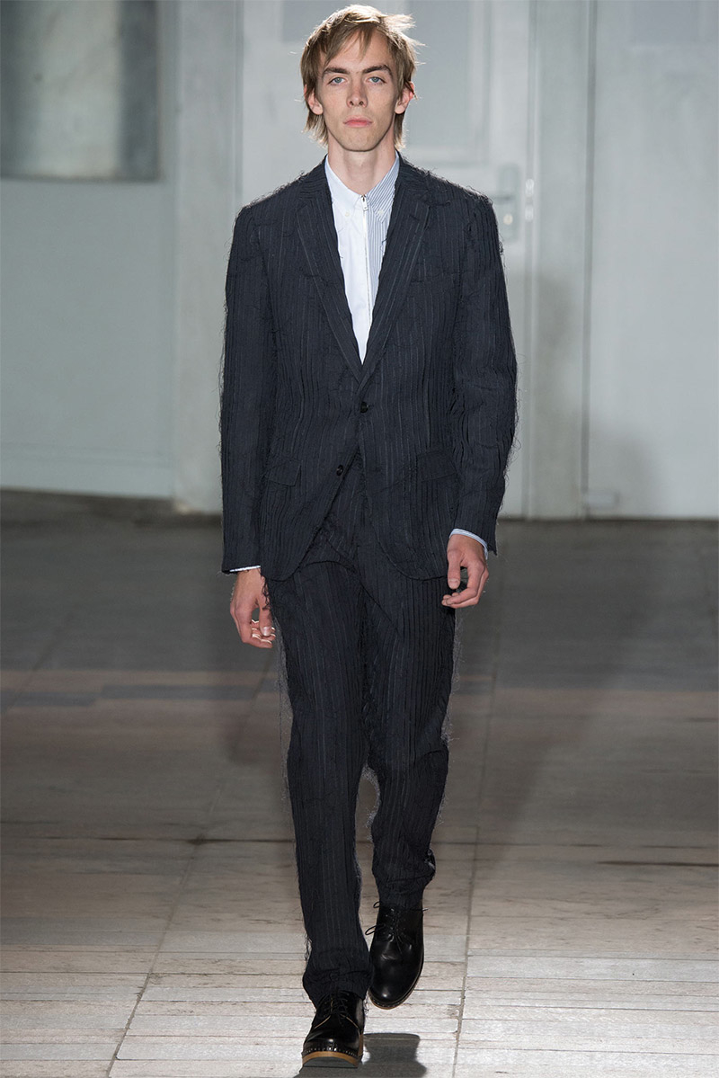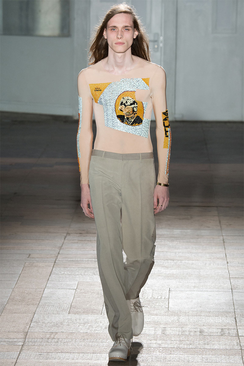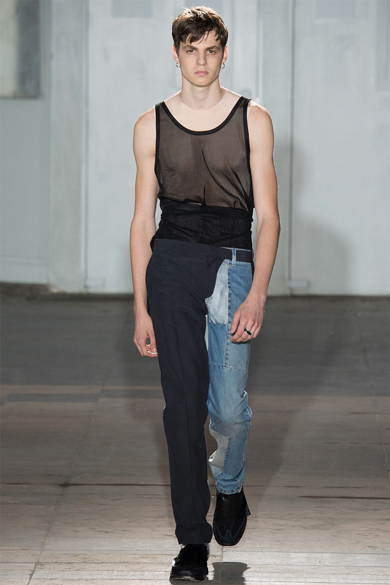 Maison Martin Margiela Spring/Summer 2015–French fashion house Maison Martin Margiela went for a light style philosophy for spring/summer 2015, crafting airy coats from parachutes. Somewhere in the midst of this idea, clothes were cut away as various textures came together. Hitting the catwalk in hybrids of denim jeans and trousers or frayed suiting, the man of Maison Martin Margiela had quite the sense of humor. Meanwhile, silhouettes fluctuated between the defined and the voluminous. Introducing sheer fabrics and flesh tones, tanks and graphic tops were best worn with parachute pants.