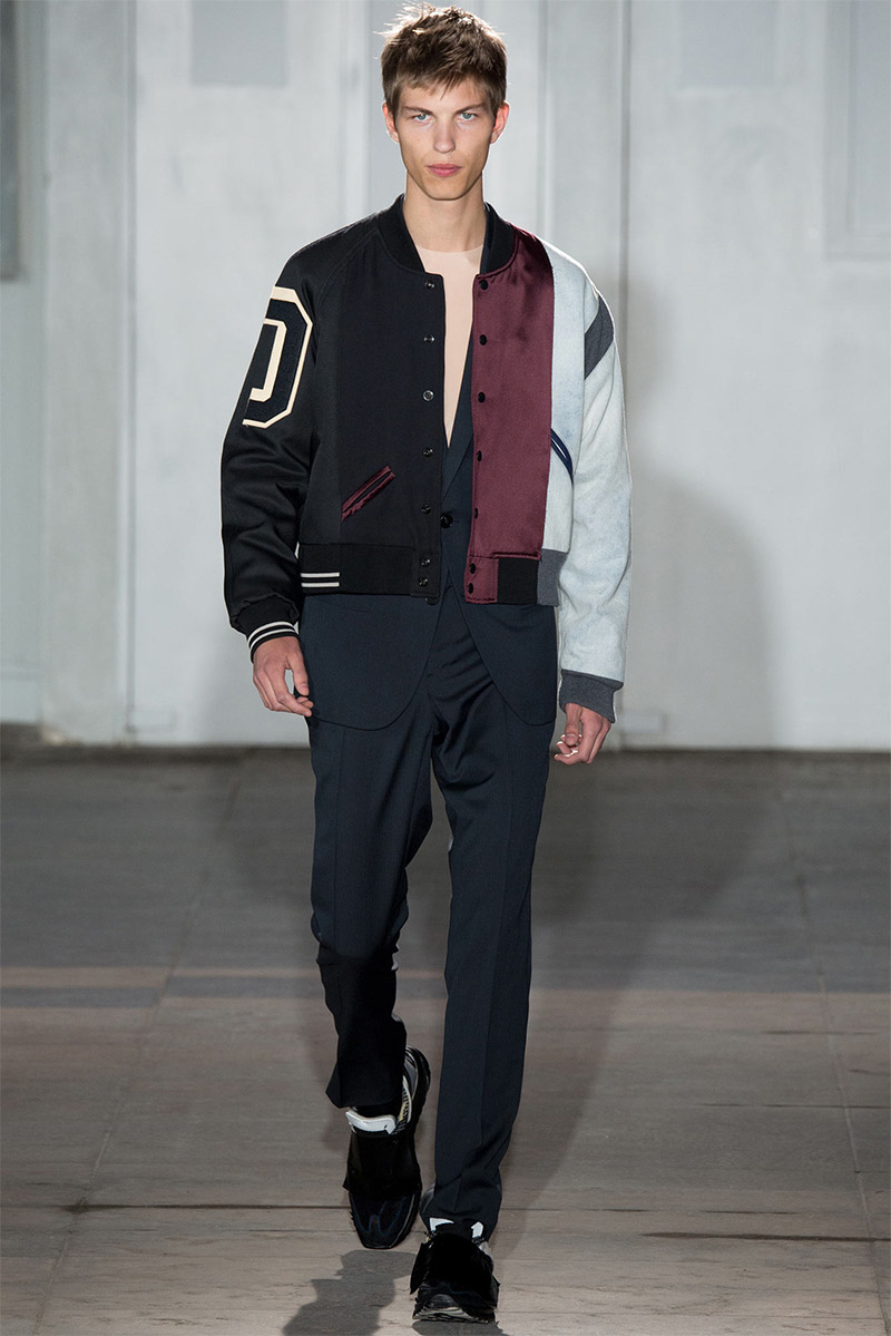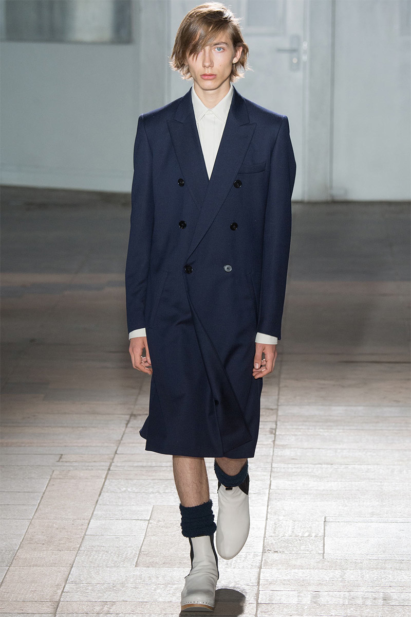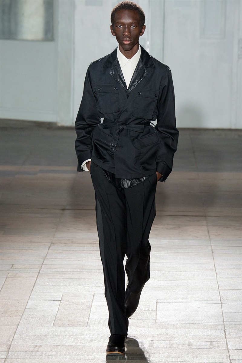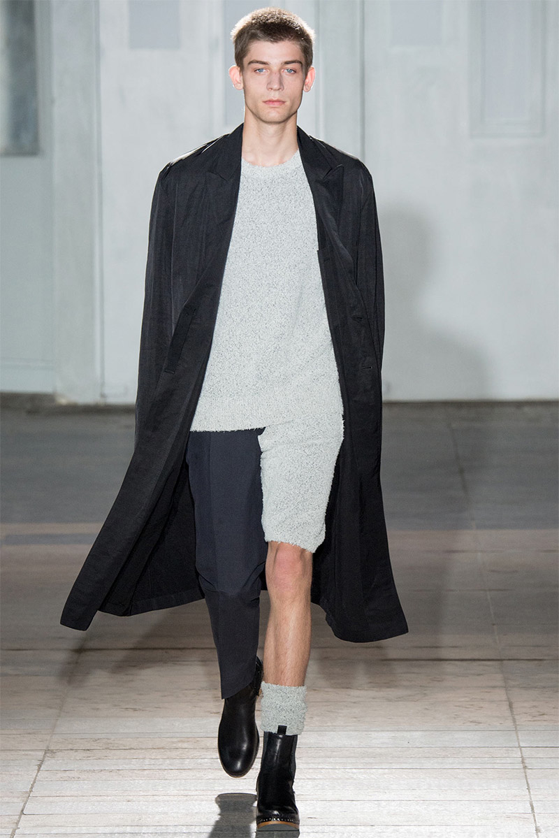 Maison Martin Margiela Spring/Summer 2015–French fashion house Maison Martin Margiela went for a light style philosophy for spring/summer 2015, crafting airy coats from parachutes. Somewhere in the midst of this idea, clothes were cut away as various textures came together. Hitting the catwalk in hybrids of denim jeans and trousers or frayed suiting, the man of Maison Martin Margiela had quite the sense of humor. Meanwhile, silhouettes fluctuated between the defined and the voluminous. Introducing sheer fabrics and flesh tones, tanks and graphic tops were best worn with parachute pants.