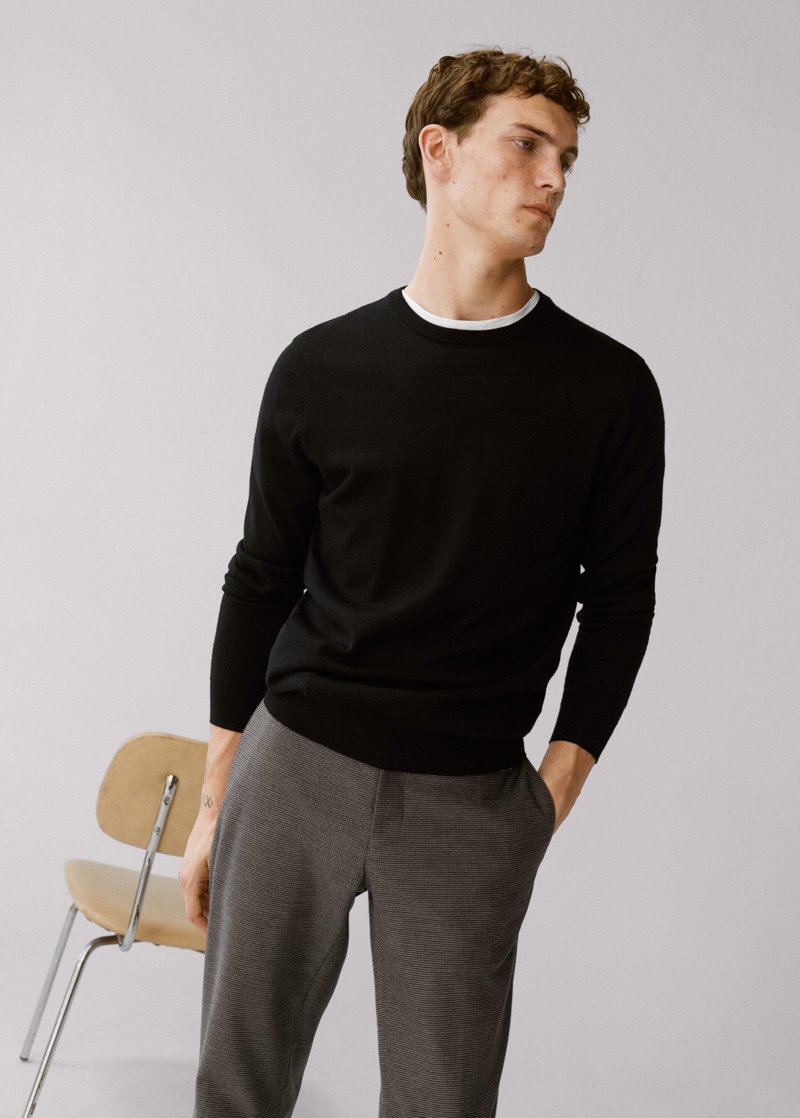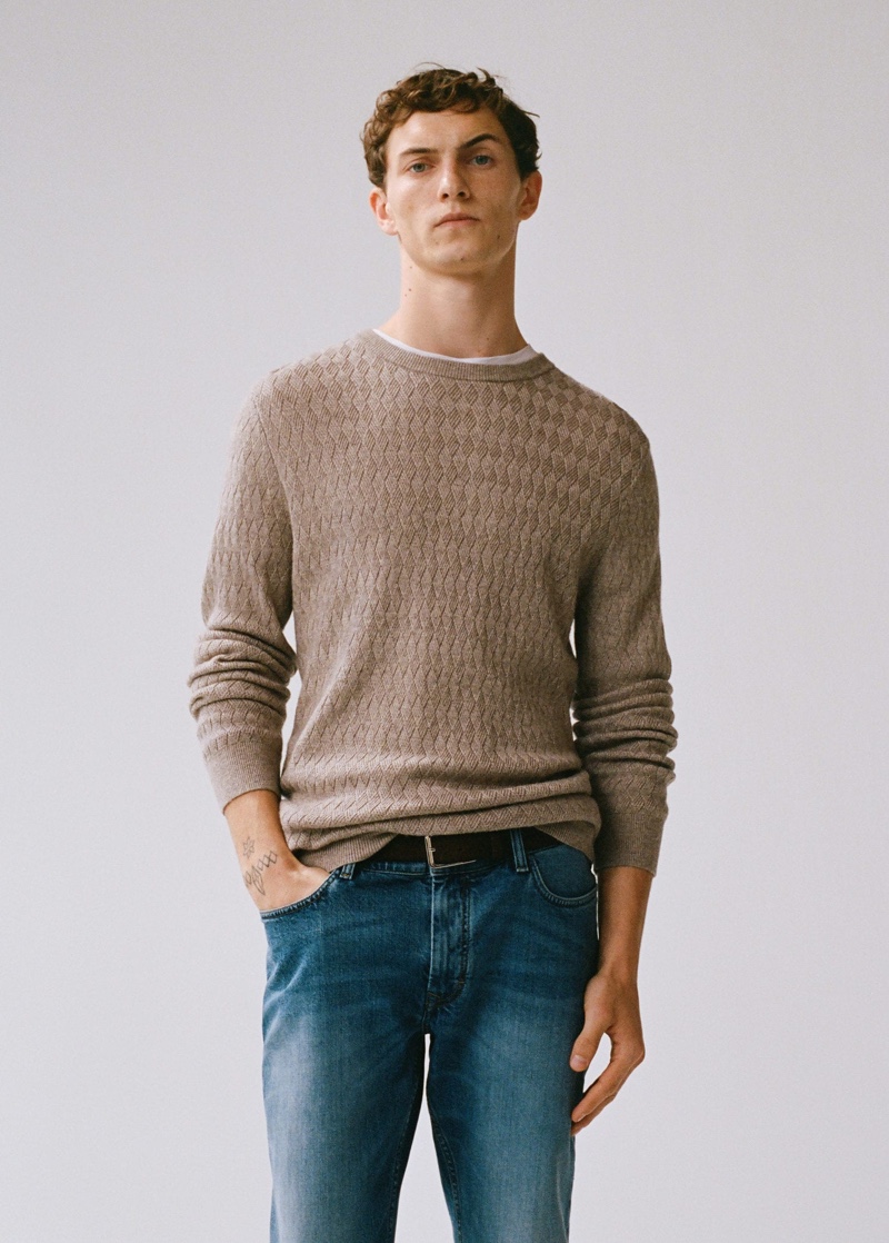 Model Luc Defont-Saviard dons a long-sleeve polo by Mango.Pin