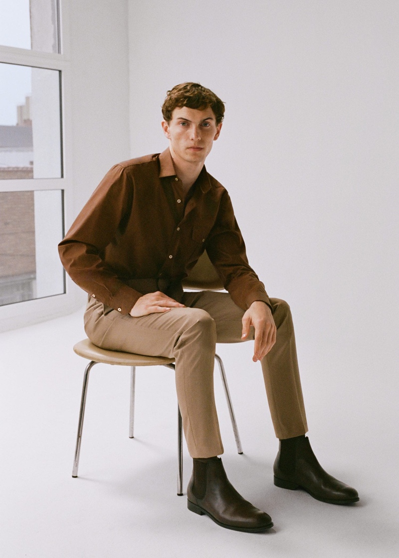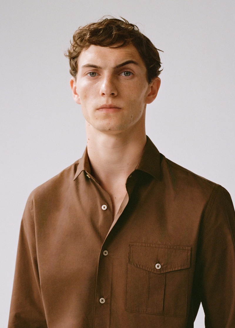 Embracing shades of brown, Luc Defont-Saviard wears Mango.