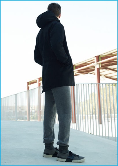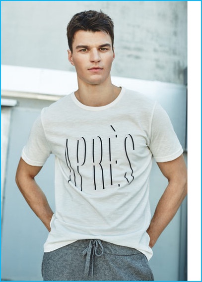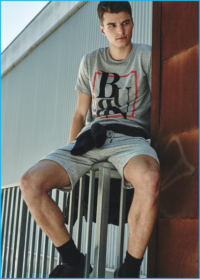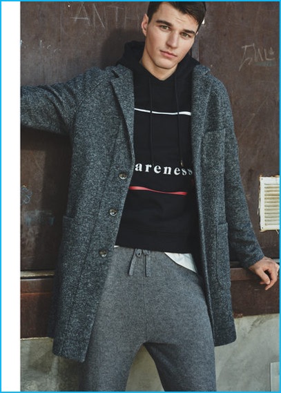 On the heels of taking a look at Mango’s fall-winter 2016 campaign, we get a sporty style update from the Spanish brand. Model Arran Sly ventures outdoors for a story entitled Urban Athletics. The English model embraces the athleisure trend, wearing a cool wardrobe that features a color palette of grey, black and white. Mango’s go-to lineup for the outing includes graphic t-shirts, slim joggers, textured sweatshirts, full-zip hoodies, and active shorts.