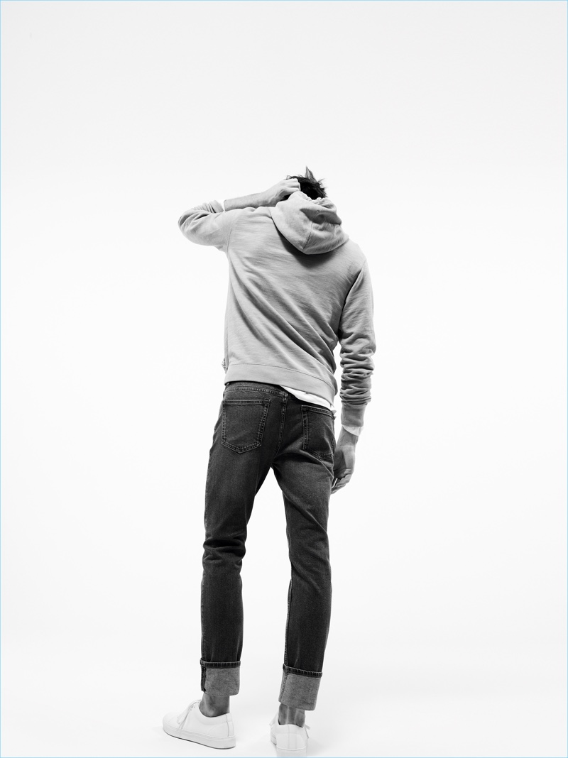 Relaxed fits anchor a collection of denim staples, which includes shirts, jackets, and jeans. Appearing in black and white images, Harvey’s wardrobe provides endless styling inspiration. Here, Mango’s denim essentials complement timeless crewneck tees, the leather biker jacket, and trendy bombers.