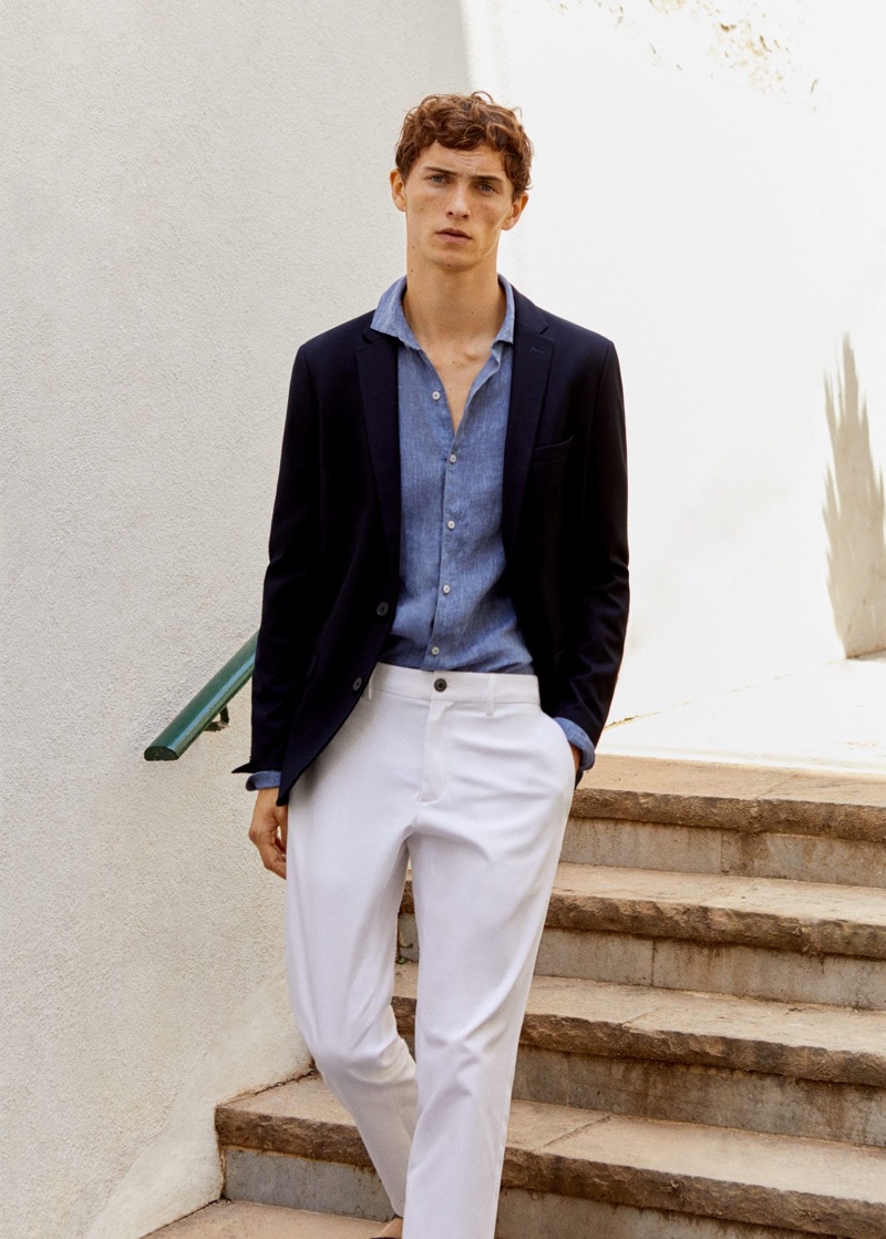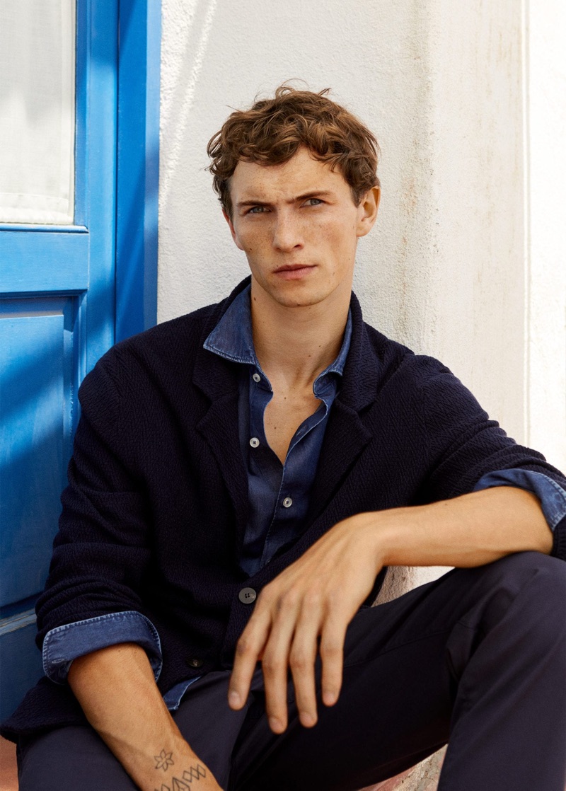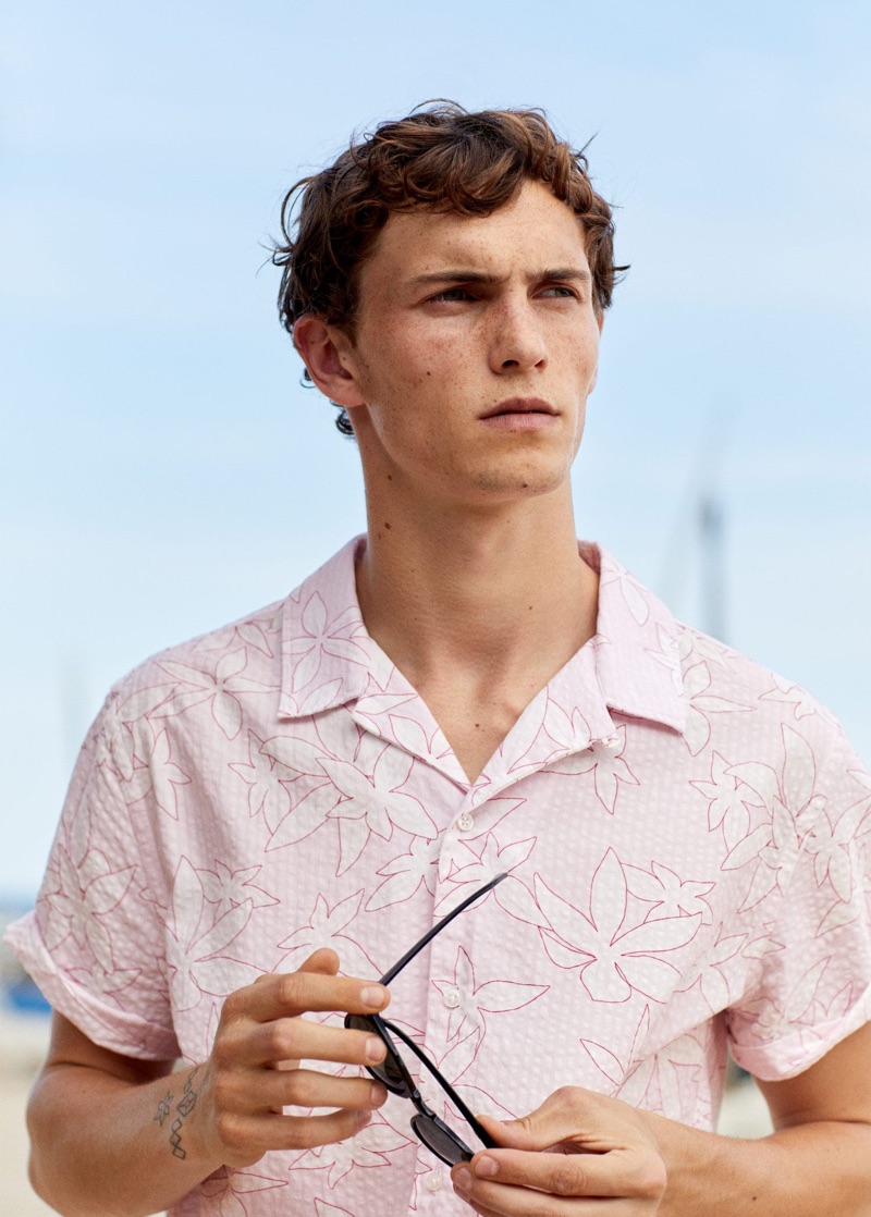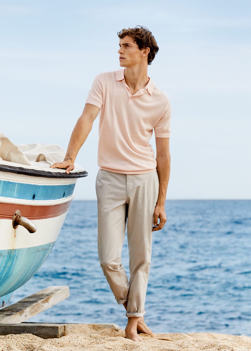 Pastel and neutral tones come together with a fresh summer wardrobe by Mango Man. The Spanish brand enlists model Luc Defont-Saviard to star in its most recent men’s outing. Embracing a sophisticated style for the beach, Luc inspires in key pieces for the season. He wears everything from a striking seersucker suit and striped oxford to classic white jeans. Other must-haves include Mango’s chambray shirt, lightweight sweaters, and overshirts.