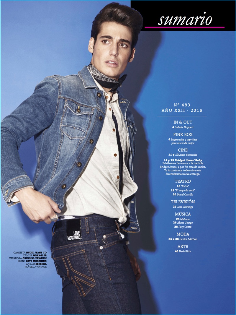 Tapping into a retro attitude, Manuel sports a pompadour hairstyle for the editorial. Danniel Rojas captures the throwback vision as Manuel doubles down on denim.