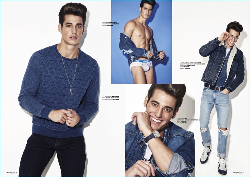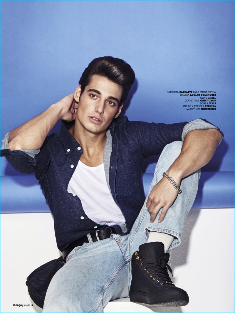Belén Claver styles Manuel Seco in denim fashions from Wrangler, Levi’s, Calvin Klein Jeans, and more.