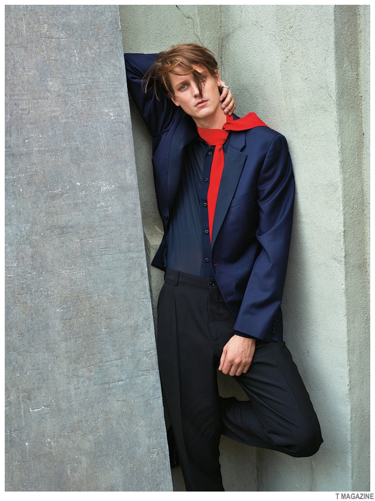 Menswear Turns Conventional-Outfitted by stylist Jason Rider, model Marc Andre Turgeon is a divine vision of style as he graces the pages of T magazine. Wearing sharp fashions with a poetic twist, Marc is ready for the holiday season in smart suiting separates and a phenomenal velvet coat. / Photography by Matthew Kristall. Hair by Shin Arima. Makeup by Asami Taguchi.