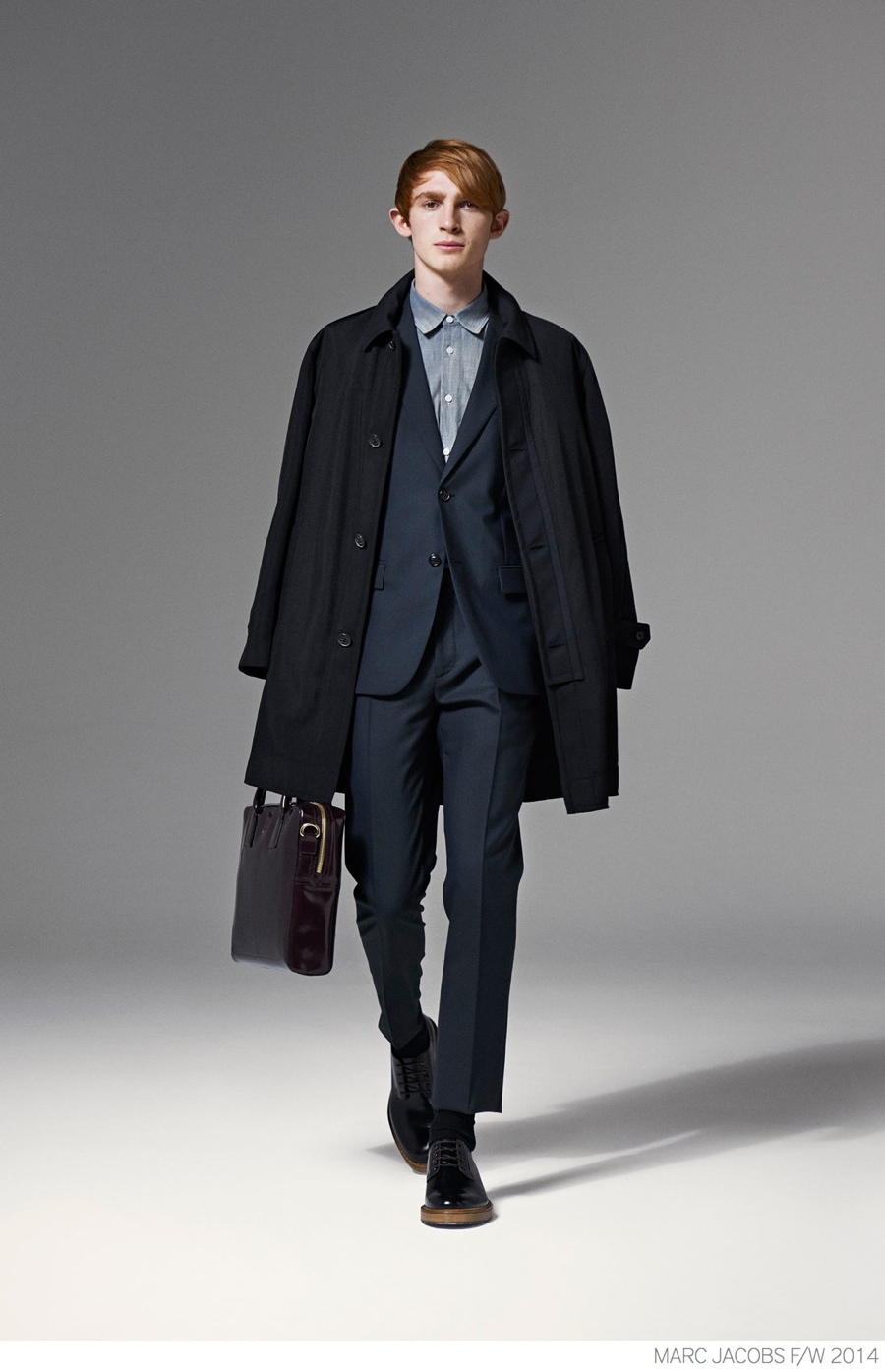Marc Jacobs Fall/Winter 2014-While Marc by Marc Jacobs represents the adventurous boy next door, who is not afraid of trying new styles, even going as far as to sample motocross aesthetics, the man of Marc Jacobs stays on the tailored path. Delivering sophisticated fashions in an autumnal color palette, the brand unveils smart suiting separates. Encompassing both wide and narrow silhouettes, trousers are pleated and cut at the ankle or extended and cuffed.