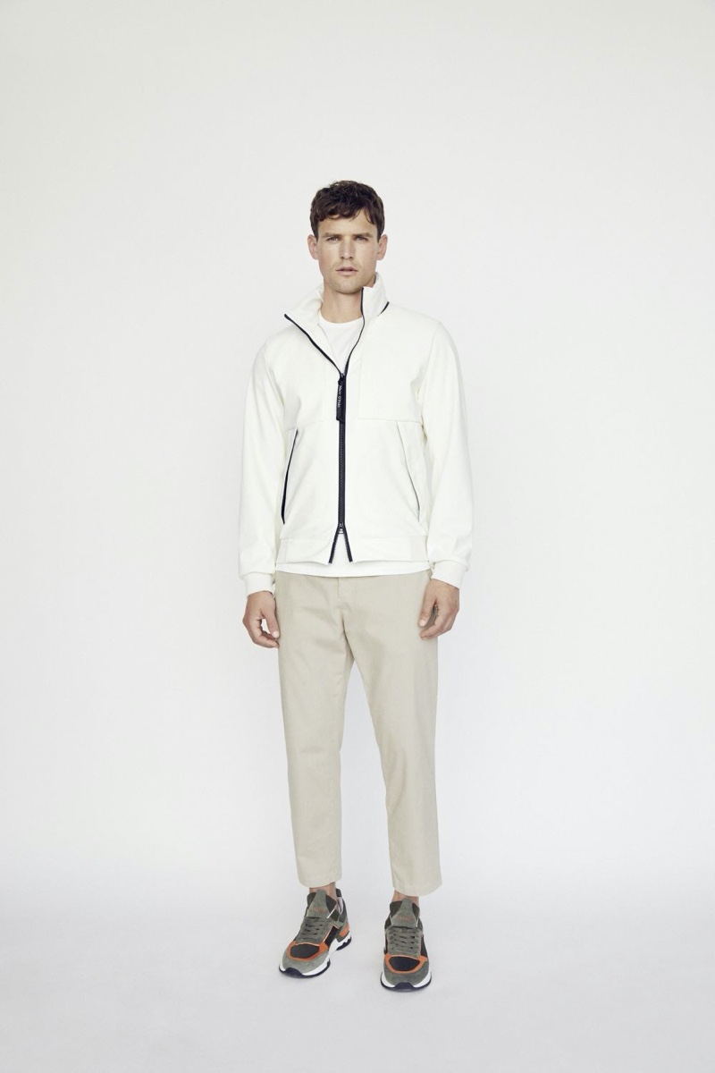 Donning neutrals, Guy Robinson layers in a hoodie and parka from Marc O’Polo.