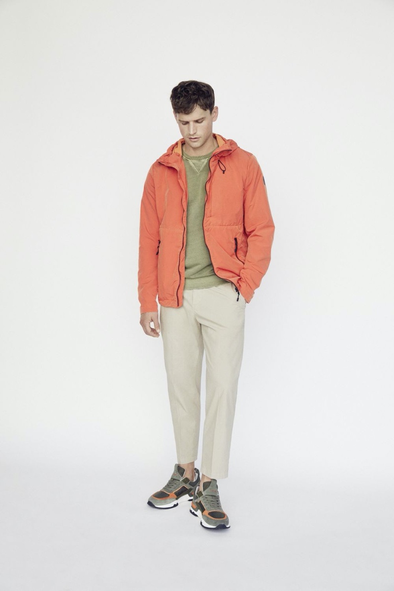 British model Guy Robinson sports a windbreaker with shorts and a bucket hat from Marc O'Polo.Pin