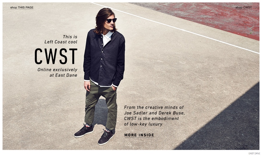 Left Coast Cool-Online retailer East Dane highlights its exclusive digital offering of CWST. Tapping Canadian model Marcel Castenmiller for a photo shoot, East Dane features the comfortable essentials that comprise CWST designers Joe Sadler and Derek Buse’s “low-key luxury.” Heading outdoors, Marcel impresses in young, skater-inspired looks that are layered with relaxed shirts, long coats and slim joggers. Shop CWST’s collection at EastDane.com.