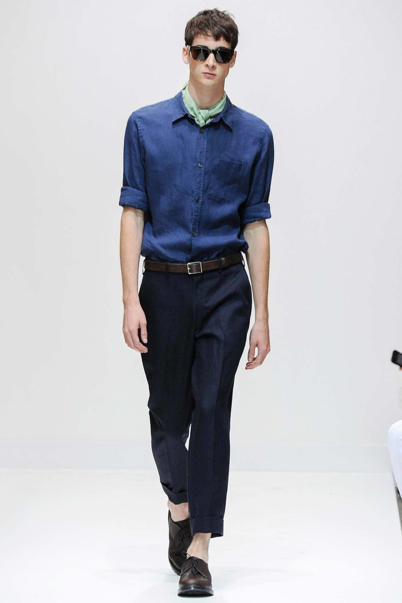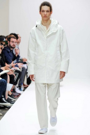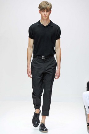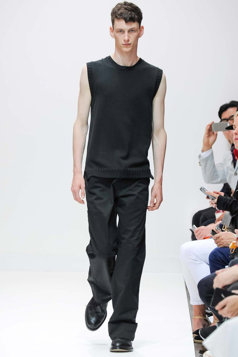 Margaret Howell Spring/Summer 2015–Margaret Howell knows how to keep its men in check. For spring/summer 2015, relaxed tailoring reigned with the strictness of a military unit. Khaki, navy and charcoal were the collection’s go to colors as Howell’s knack for menswear essentials delivered a comfortable wardrobe of crewneck sweaters, short-sleeve shirts with narrow lapels, sleeveless knits and smart cardigans. Combined with shirt jackets and handy carryalls, the man of Margaret Howell played style by the rules and while a little uptight, came out with a solid fashion statement.