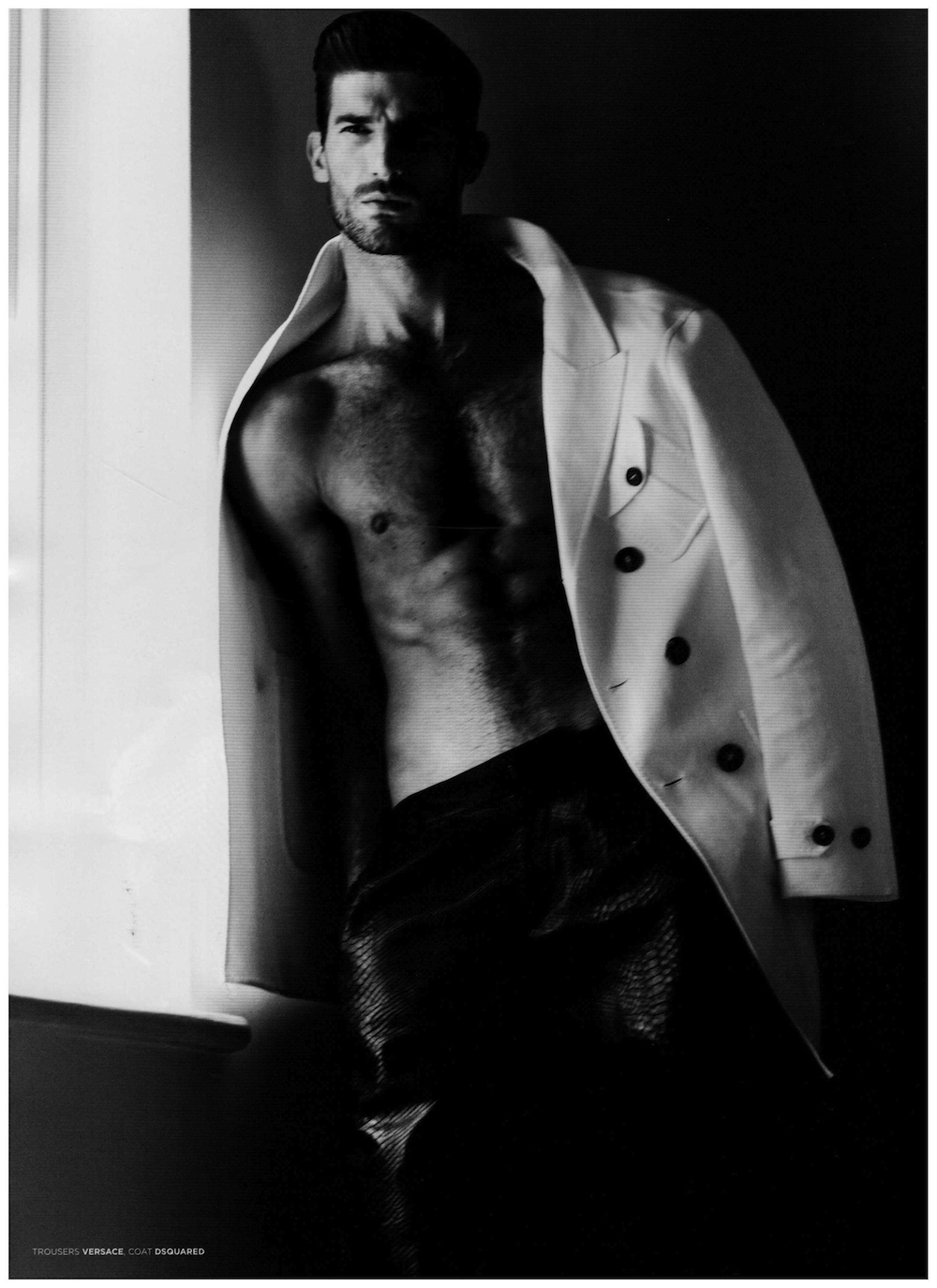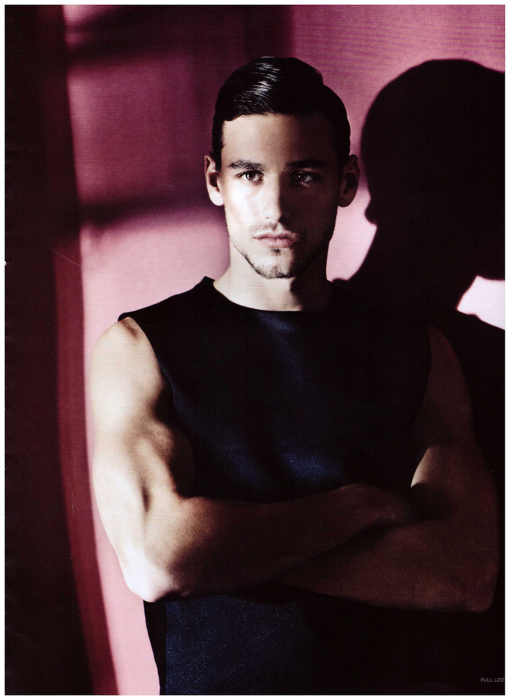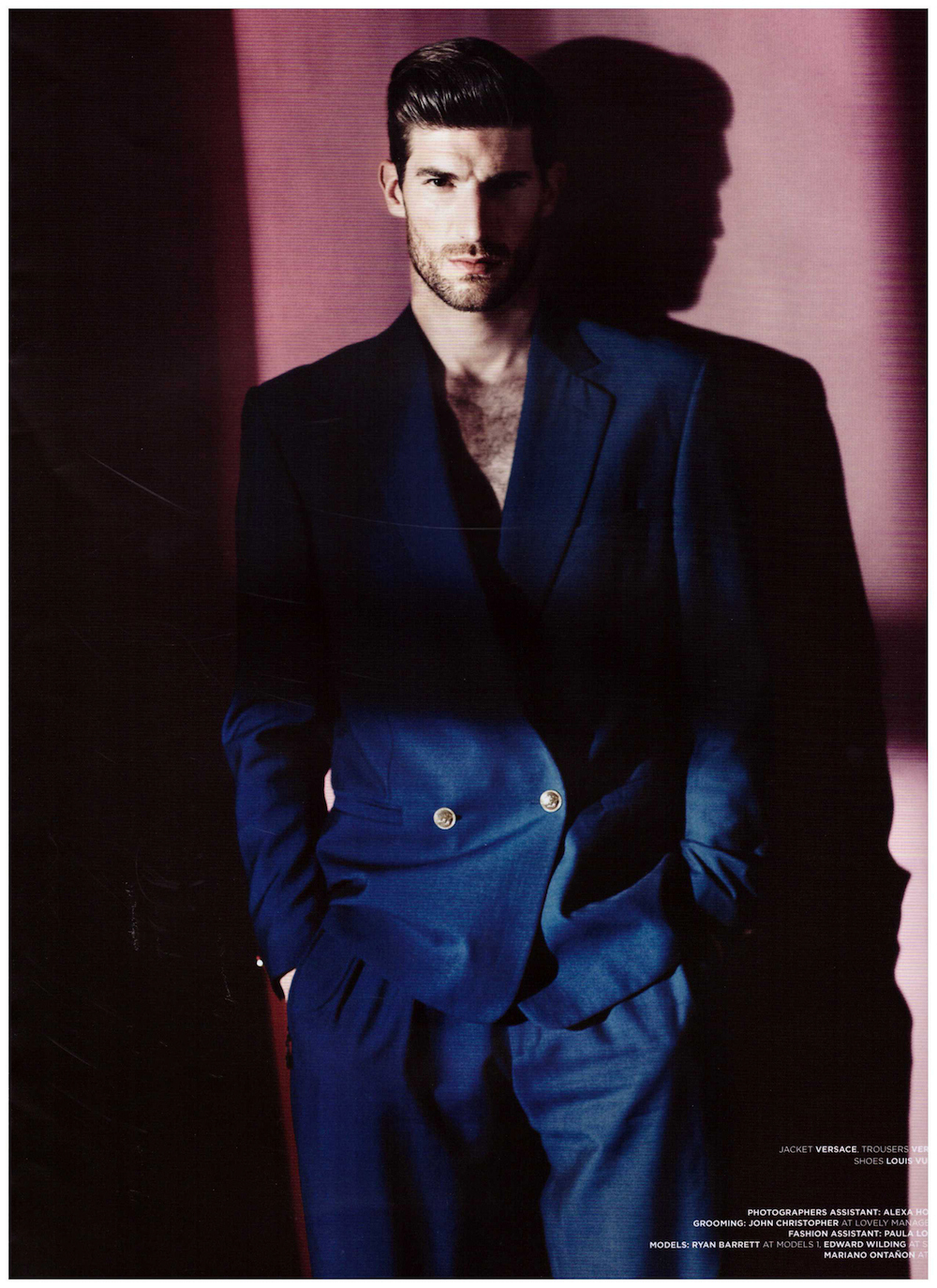 Beauty In The Shadows–After appearing in a group shot for the spring/summer 2014 cover of Seventh Man magazine, models Mariano Ontañon, Edward Wilding and Ryan Barrett reunite with photographer Dan Smith for an alluring cover story. Captured in the shadows, the models are styled by Dean Hau, the magazine’s fashion director, in summer ensembles from the likes of Versace, Tom Ford and many more. Embracing a wardrobe that juxtaposes sorbet tones, geometric patterns and dark hues, the models prove the functional facet of contemporary menswear, which goes beyond its innate glamorous attitude. / Photo assistance by Alexa Horgan. Styling assistance by Paula London. Grooming by John Christopher.