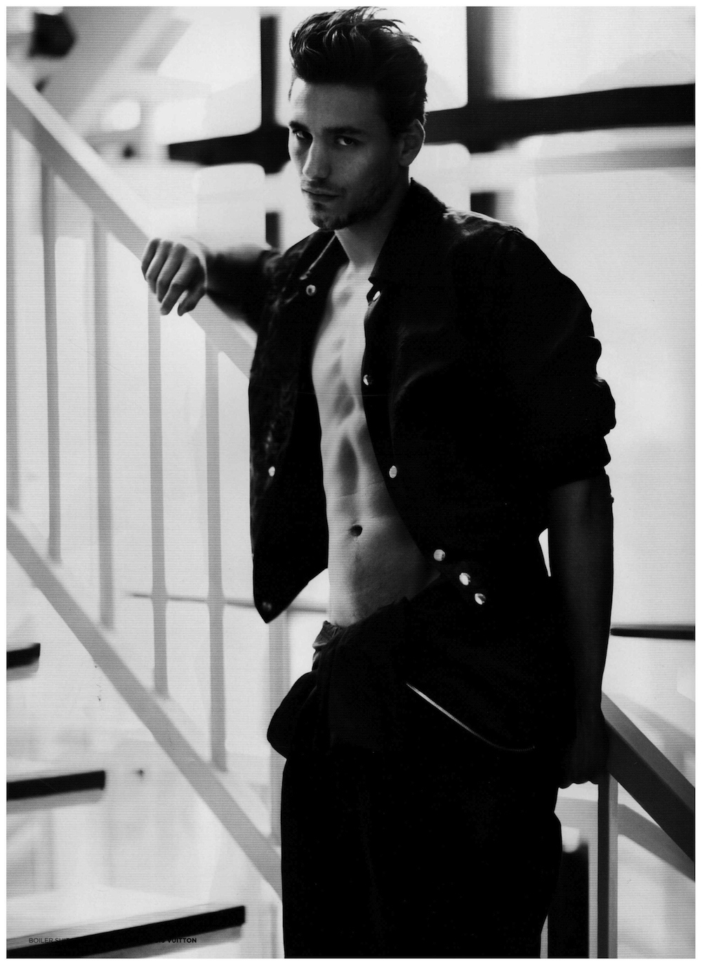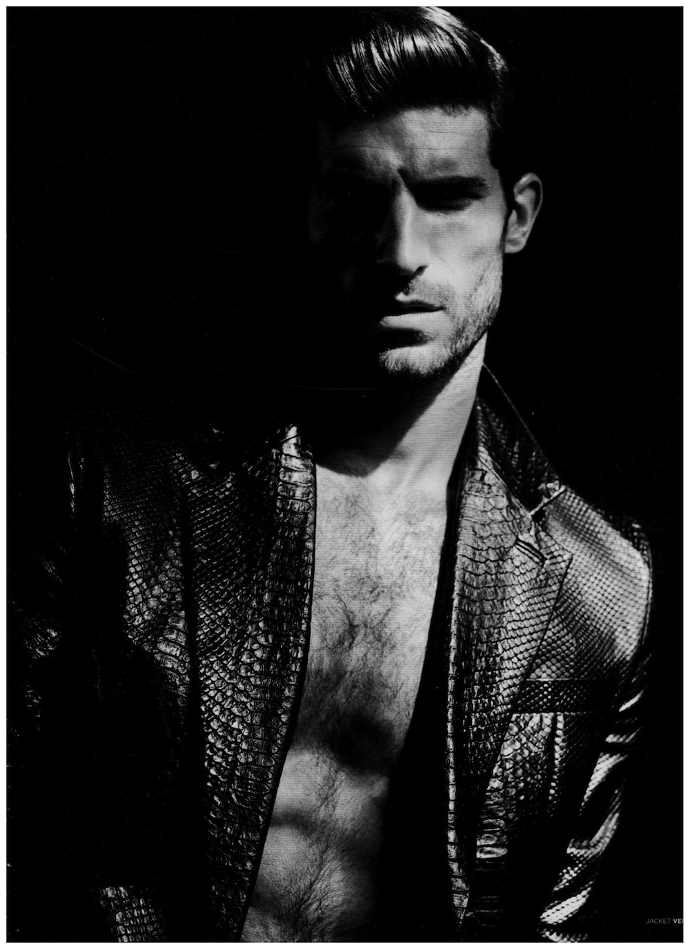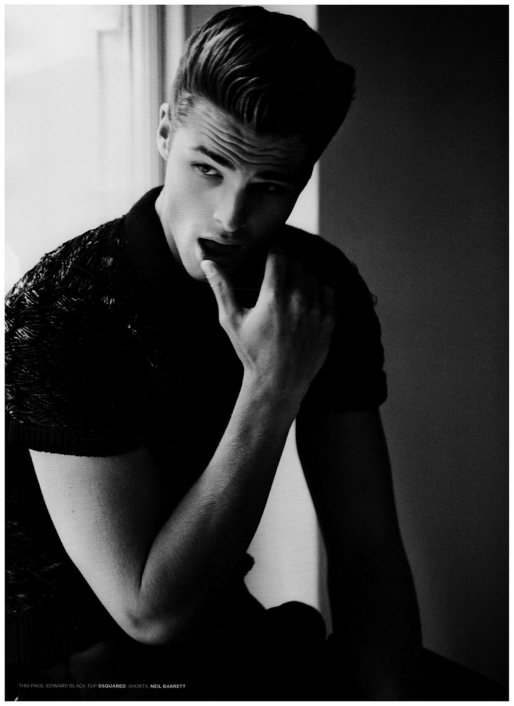 Beauty In The Shadows–After appearing in a group shot for the spring/summer 2014 cover of Seventh Man magazine, models Mariano Ontañon, Edward Wilding and Ryan Barrett reunite with photographer Dan Smith for an alluring cover story. Captured in the shadows, the models are styled by Dean Hau, the magazine’s fashion director, in summer ensembles from the likes of Versace, Tom Ford and many more. Embracing a wardrobe that juxtaposes sorbet tones, geometric patterns and dark hues, the models prove the functional facet of contemporary menswear, which goes beyond its innate glamorous attitude. / Photo assistance by Alexa Horgan. Styling assistance by Paula London. Grooming by John Christopher.