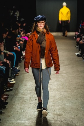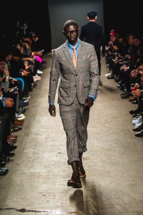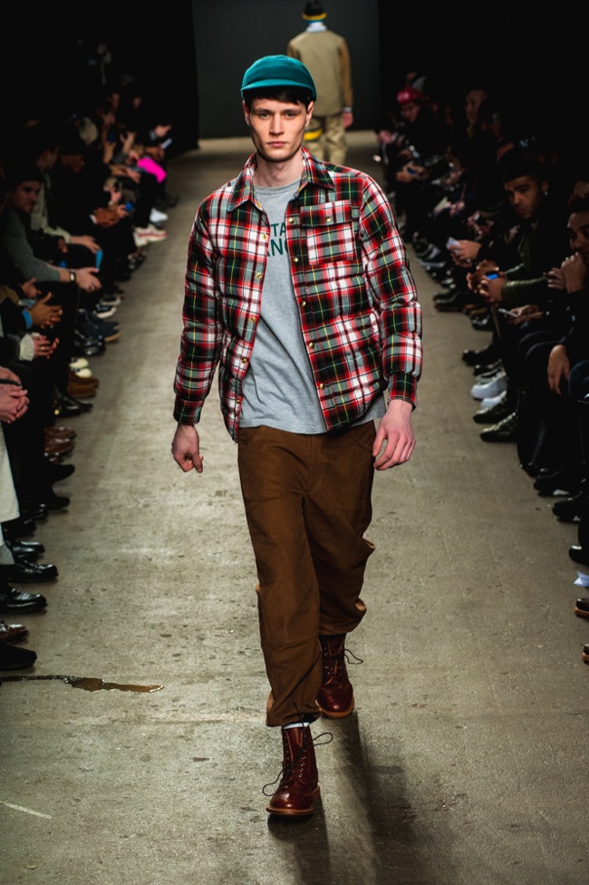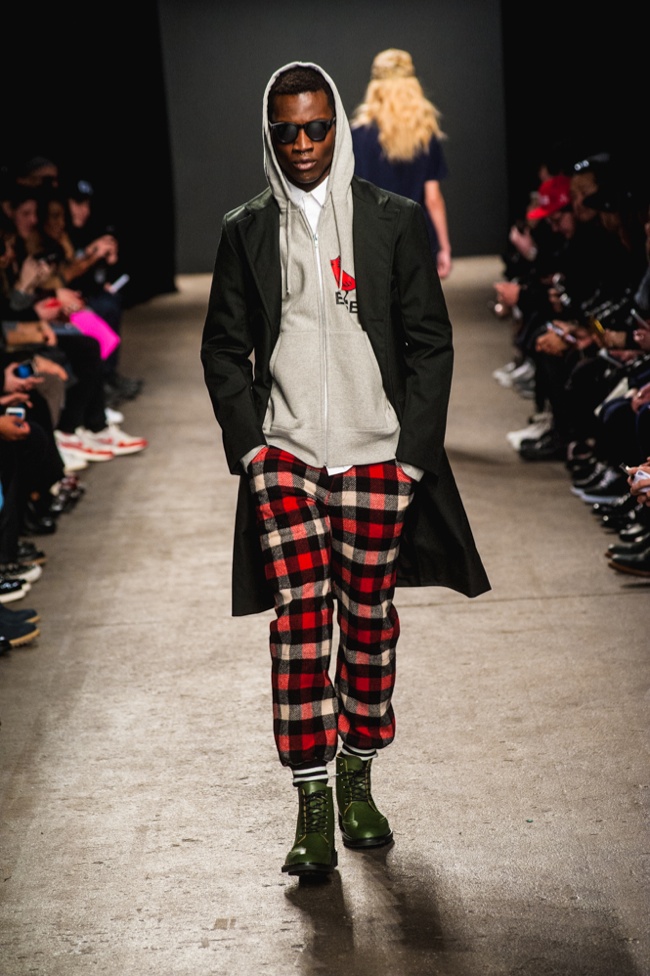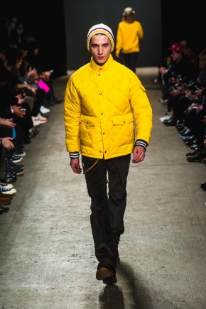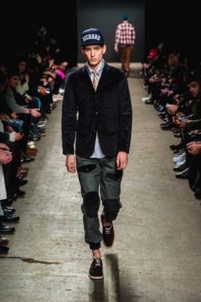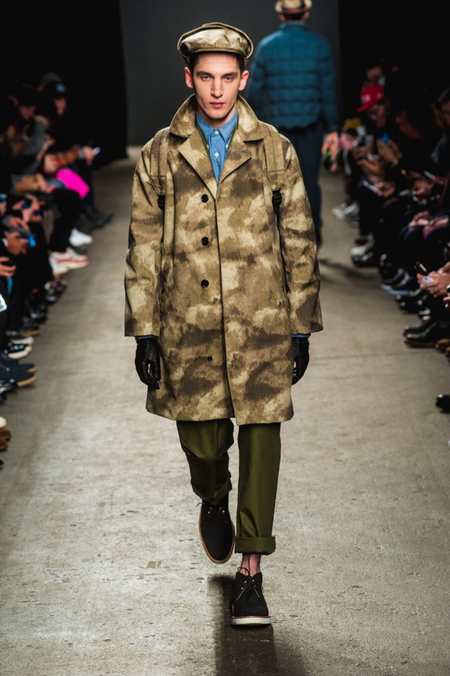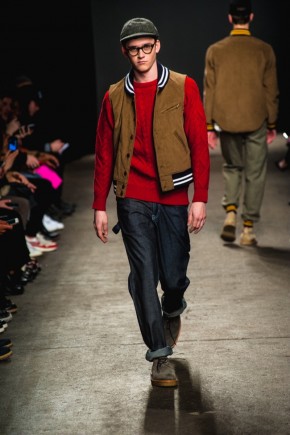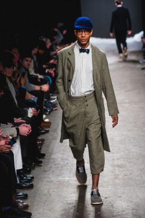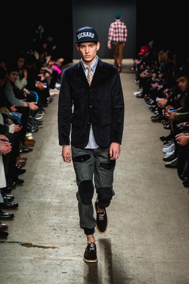 Mark McNairy New Amsterdam Fall/Winter 2014–Presenting his signature take on streetwear for fall/winter 2014, Mark McNairy also unveiled collaborations with Adidas for footwear and Garrett Leight Glasses. Mixing smart classic styles with streetwear, a nice fusion came together with looks that exuded a certain ease. Here shirts with bow-ties, cardigans and long tailored chic coats were juxtaposed with slim baggy pants, faux fur outerwear and varsity jackets.