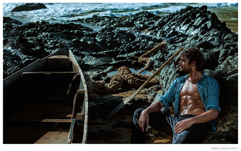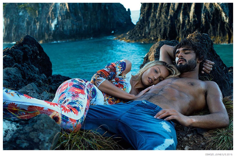 Swept Away-Brazilian leading model Marlon Teixeira hits a rocky beach for the spring/summer 2015 campaign of Osmoze Jeans. Joined by blonde bombshell and Victoria Secrets angel, model Candice Swanepoel, Marlon is a vision of perfect calmness in the solo ads, while becomes a more seductive spirit in the couple shots. Dressed in the label’s casual designs, Marlon sports washed jeans, printed tees, striped designs and denim shirts, for an effortless definition of daily style. / Photos by Gui Paganini. Styling by Pedro Sales. Art direction by Daniel Burman (Studio Burman). Grooming by Daniel Hernandez. Set design by Felipe Tadeu. Executive production by Mangaba Produções.