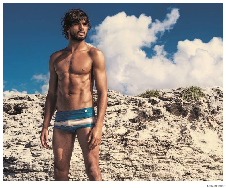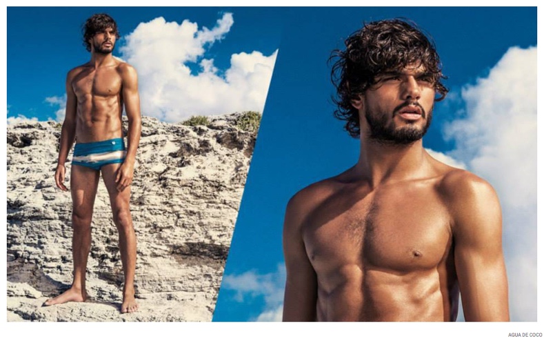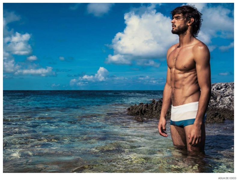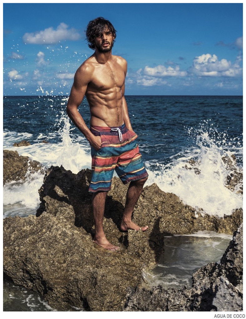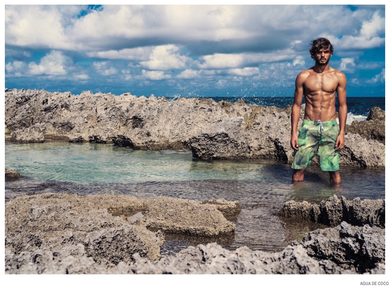 After starring in a night photo shoot, Brazilian model Marlon Teixeira reunites with Agua De Coco for its spring-summer 2015 campaign. Visiting the Bahamas, the Way Management model takes in scenic surroundings as he poses for the lens of photographer Eduardo Rezende. Fitting right in with his environment, Marlon models Agua De Coco’s latest range of swimwear, which includes cool colors and tropical prints.