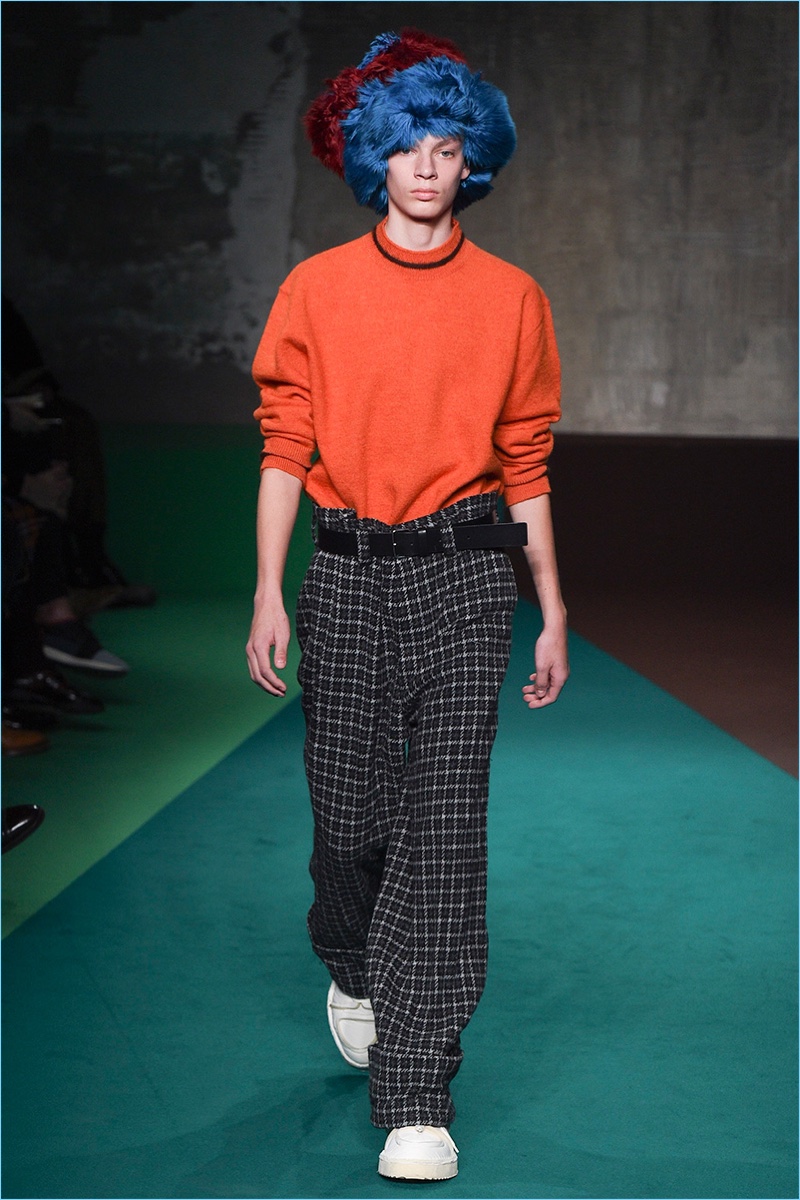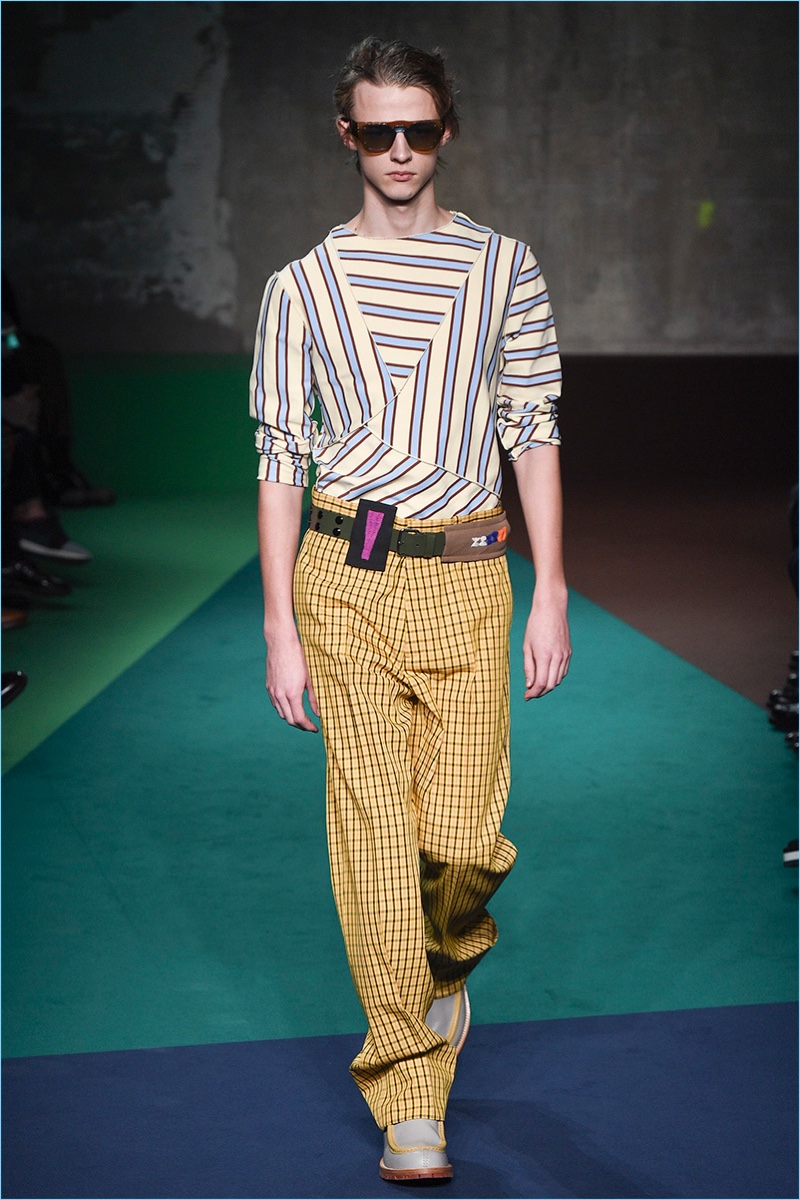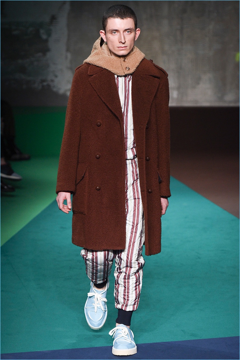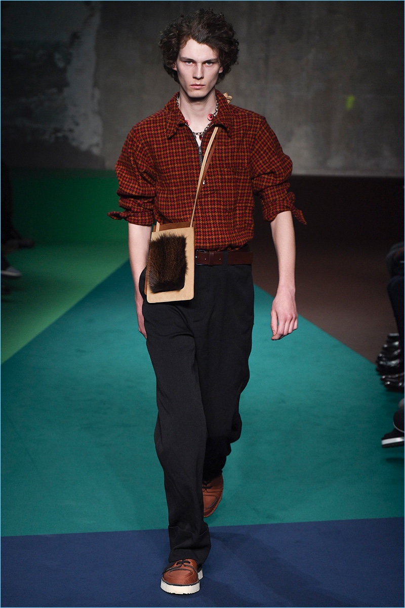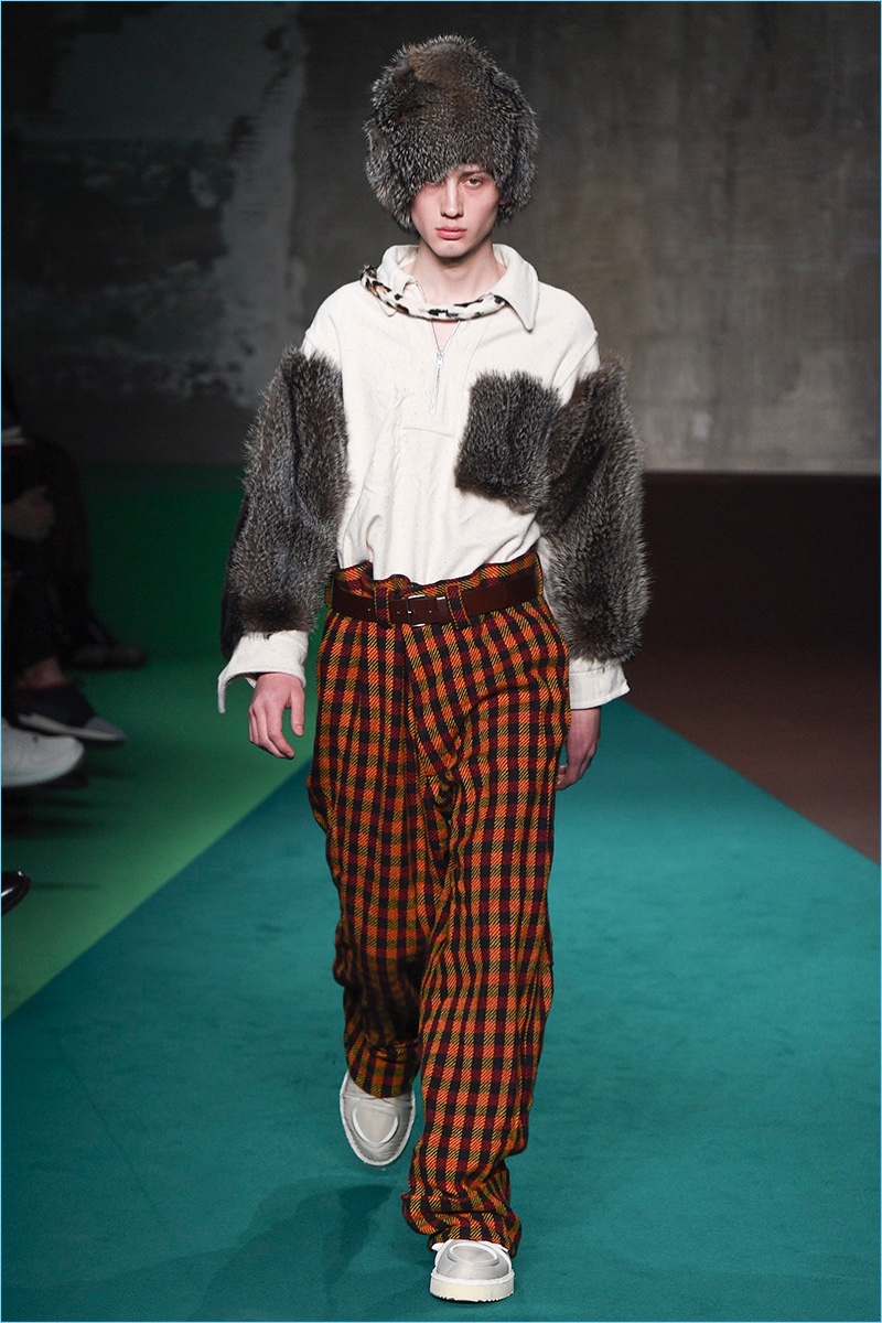 Marni continued a season of firsts as new creative director Francesco Risso made his runway debut. The designer presented a fall-winter 2017 collection, which turned up the dial on Marni’s whimsical DNA. Imagining a period of style exploration for young men, Risso unveiled eclectic styles with relaxed proportions. Tartan and stripes contributed to the lineup with quilted pants, paper bag waist trousers, single-breasted coats, and crewneck sweaters. Marni’s fall outing concluded with a series of statement shaggy outerwear.