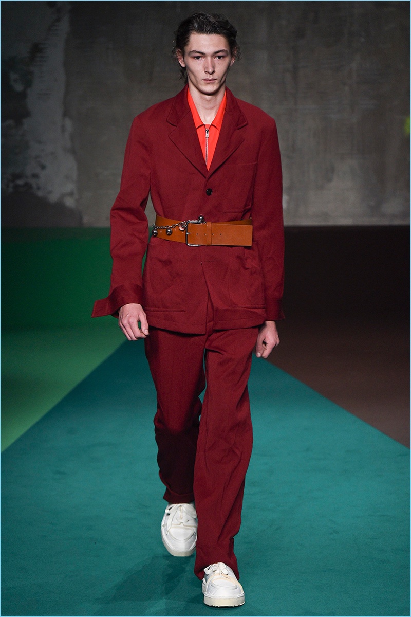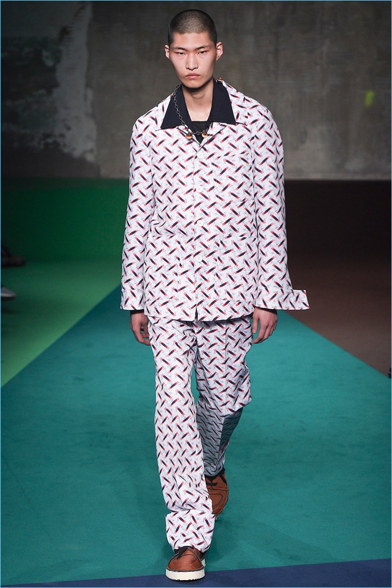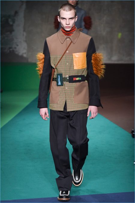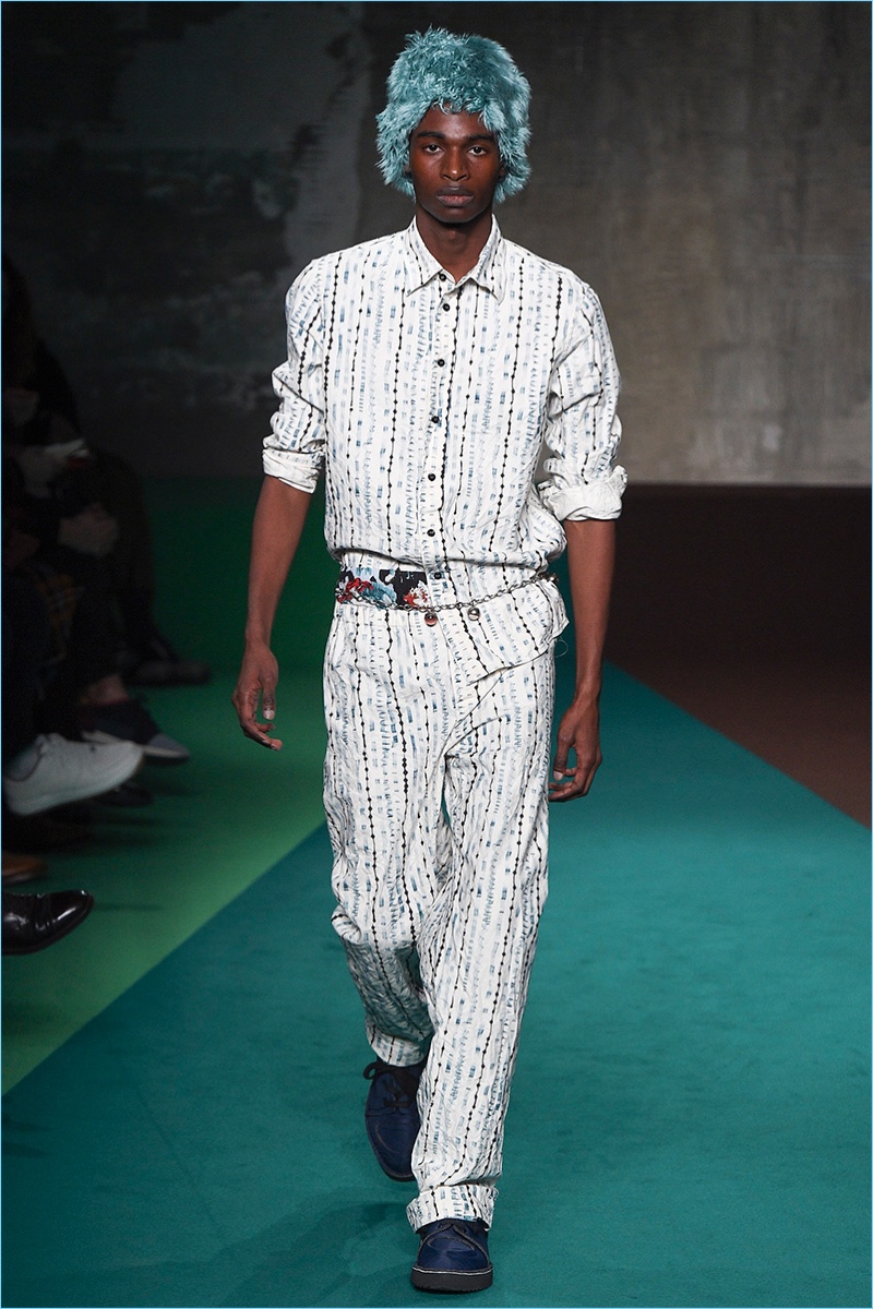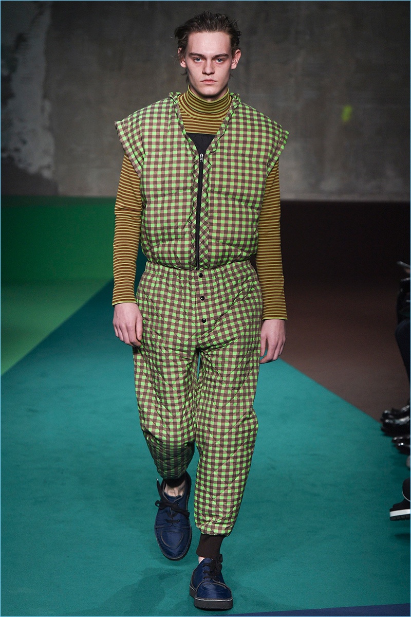 Marni continued a season of firsts as new creative director Francesco Risso made his runway debut. The designer presented a fall-winter 2017 collection, which turned up the dial on Marni’s whimsical DNA. Imagining a period of style exploration for young men, Risso unveiled eclectic styles with relaxed proportions. Tartan and stripes contributed to the lineup with quilted pants, paper bag waist trousers, single-breasted coats, and crewneck sweaters. Marni’s fall outing concluded with a series of statement shaggy outerwear.