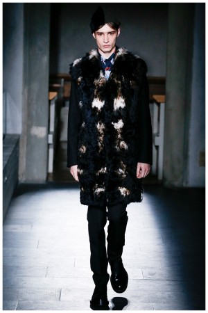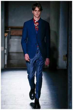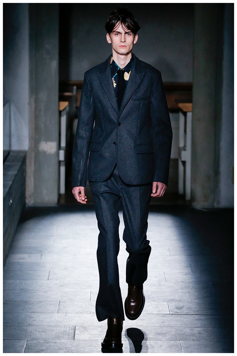 Presenting its latest collection during Pitti Uomo, Italian label Marni staged its fall-winter 2015 menswear show at the Museo Marino Marini. An extension of the season’s theme, the show’s venue represented an effort to take a longing gaze at the past and repurpose its desirable elements for the present. Embracing its quirky heritage, Marni reinvented the wheels of formal dress for its man. Tailoring was strong and lines minimal, but details revisited. Checks were mismatched, jackets compacted, trousers flared at the hem and suits broken. Dressed in an earthy color palette and highlighted with splashes of bold hues such as yellow, Marni delivered a well-rounded outing that was reinforced with smart accessories that included zip-up boots, goat fur backpacks, leather derbies and wool apron bags.