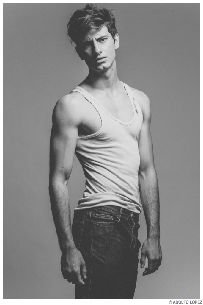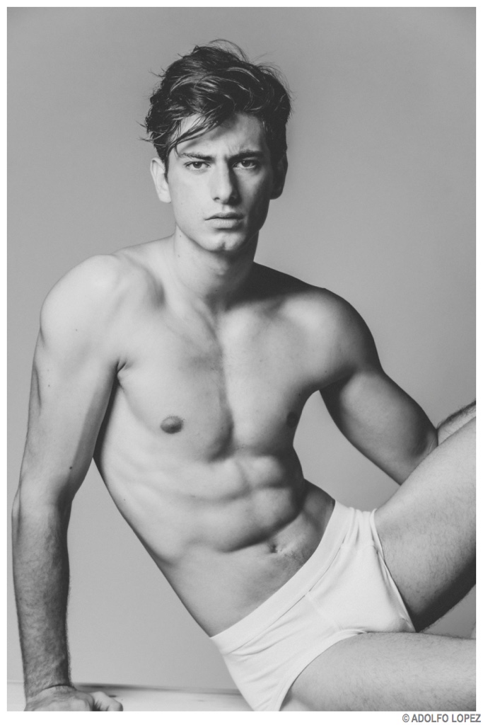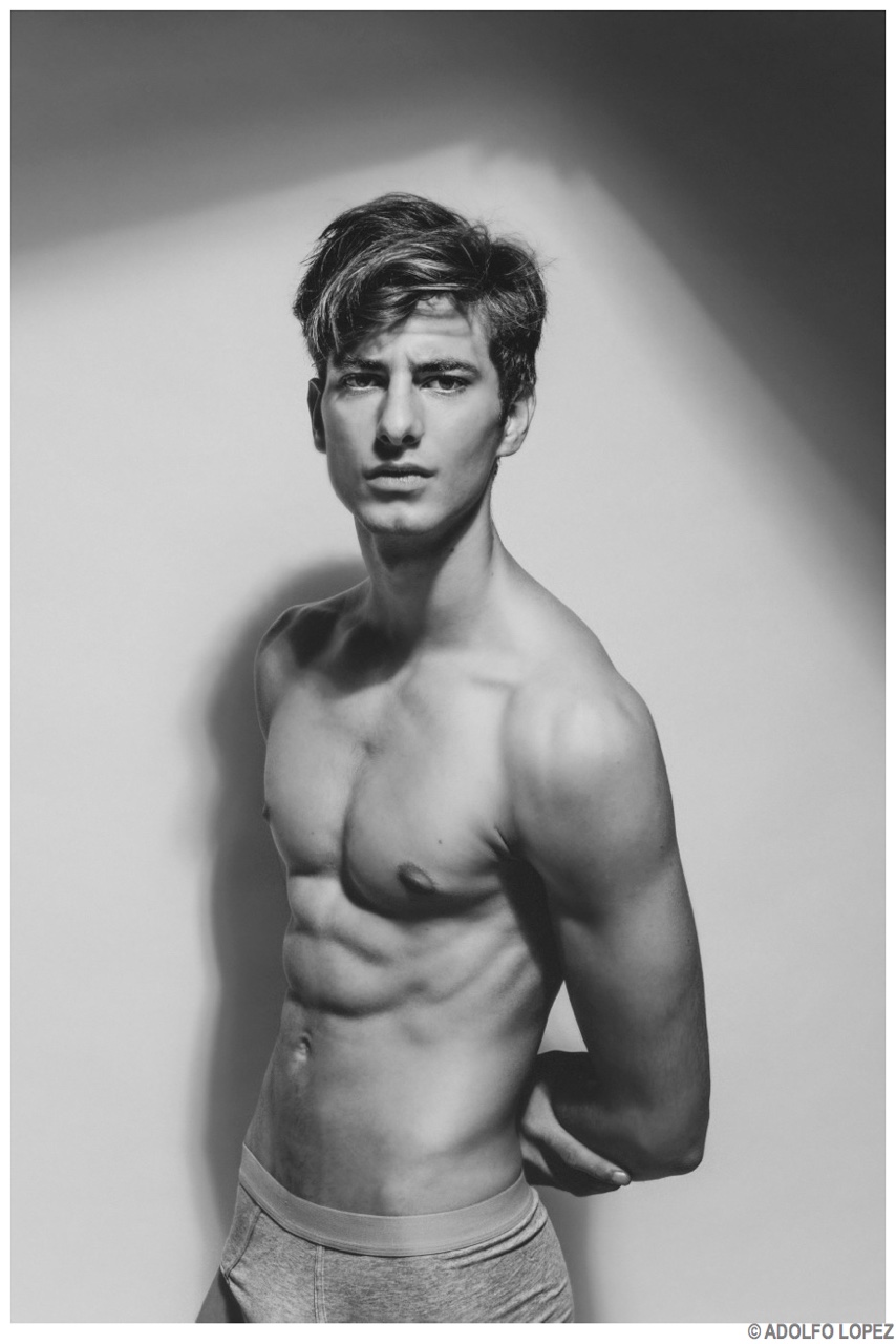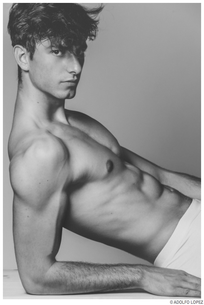 Fashion Art Mgmt model up and comer and a finalist in Elite’s Spanish model contest, Martin Chuecos links up with photographer Adolfo Lopez for a quintessential black & white portrait session. Posing in his underwear, Martin hits sharp angles with a minimal presentation that highlights his strong features.