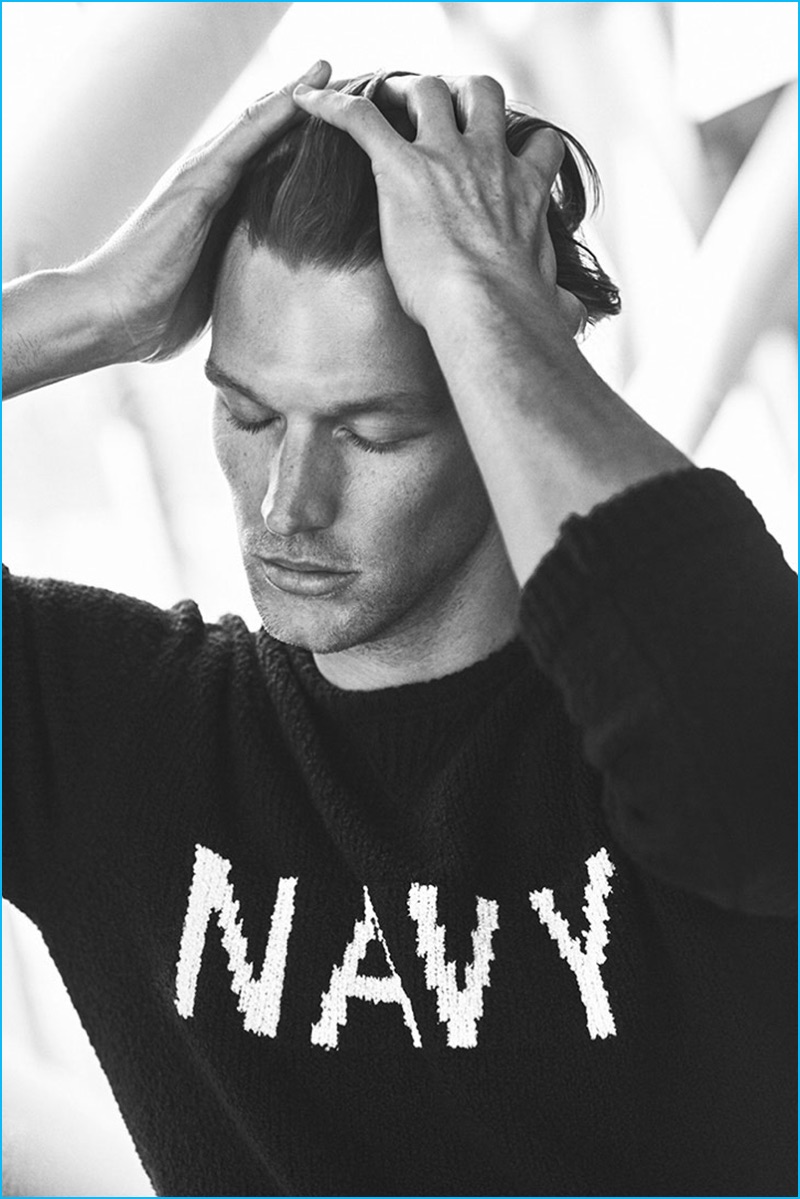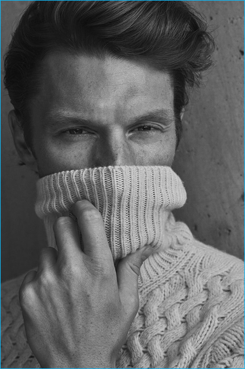 PinSouth African model Shaun DeWet dons a cable-knit turtleneck sweater from Massimo Dutti.