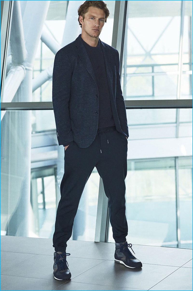PinShaun DeWet wears a limited edition wool coat, grey pullover, jogging trousers, and contrast leather sneakers from Massimo Dutti.