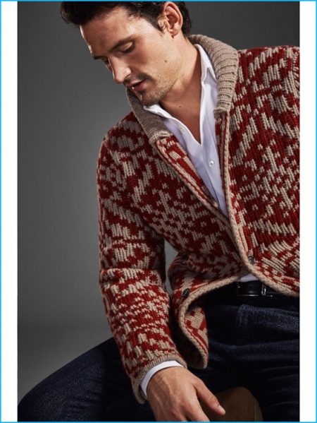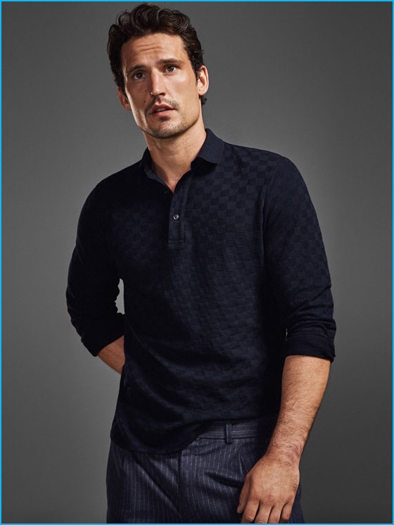Embracing sophisticated wardrobe staples, the British model wears a color palette of grey and blue. Here, braided detail sweaters, pinstripe jogging chinos, wool suiting, single-breasted coats, and more strengthen the label’s collection. On a sporty note, technical trench coats and quilted nappa jackets add a casual element to the new range.