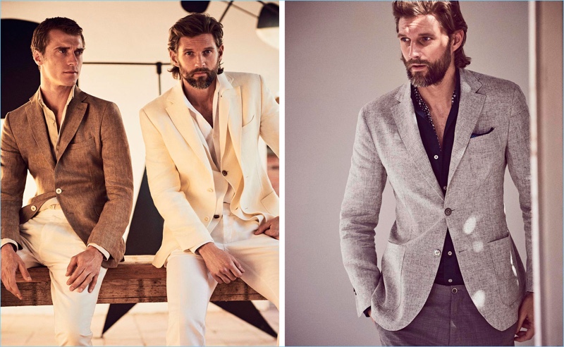 PinSean O’Pry showcases Massimo Dutti’s latest range of fine suiting.PinLeft: RJ Rogenski lounges in a smart waistcoat with a linen shirt. Right: Sean O’Pry dons Massimo Dutti suiting.