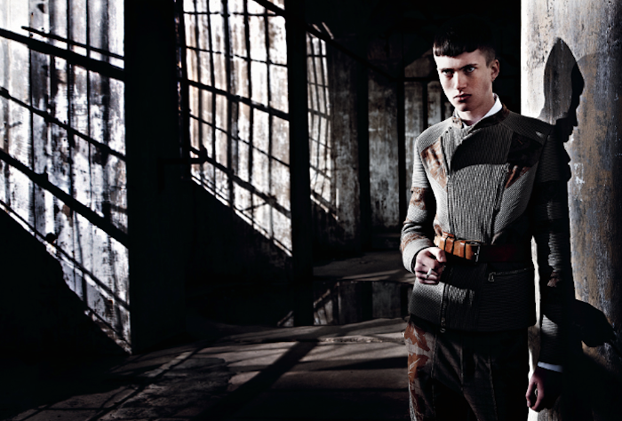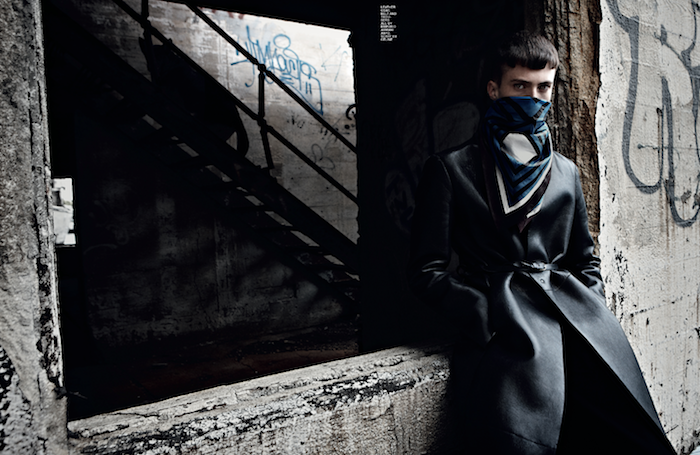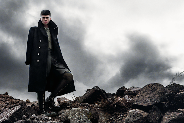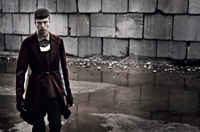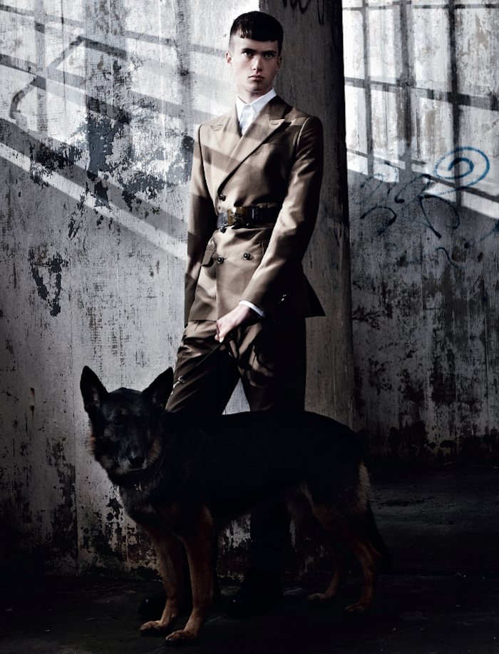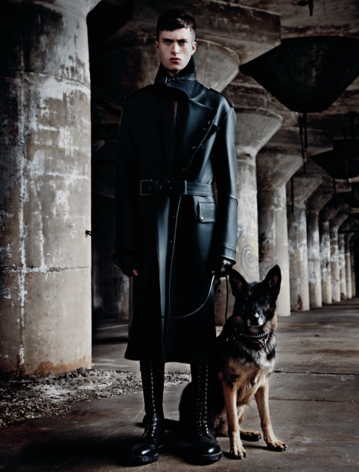 Strictness–Styled by Gro Curtis in austere military-inspired designs, American model Matt Ardell appears before the lens of Christian Ferretti in an enigmatic editorial published in the latest issue of Hero magazine. Lensed in a stormy day, Matt is a young vision of discipline in structured coats and slim suits inspired by austere military uniforms. Black leather boots and a fierce German Shepherd complete the looks, adding a stronger spin to the images. / Hair by Kenna. Makeup by John McKay.