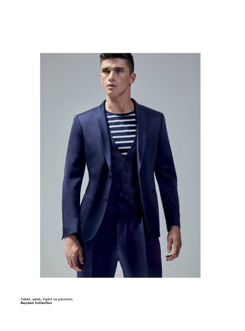 A smart vision, Matthew Holt dons a grey suit from Beymen Collection.