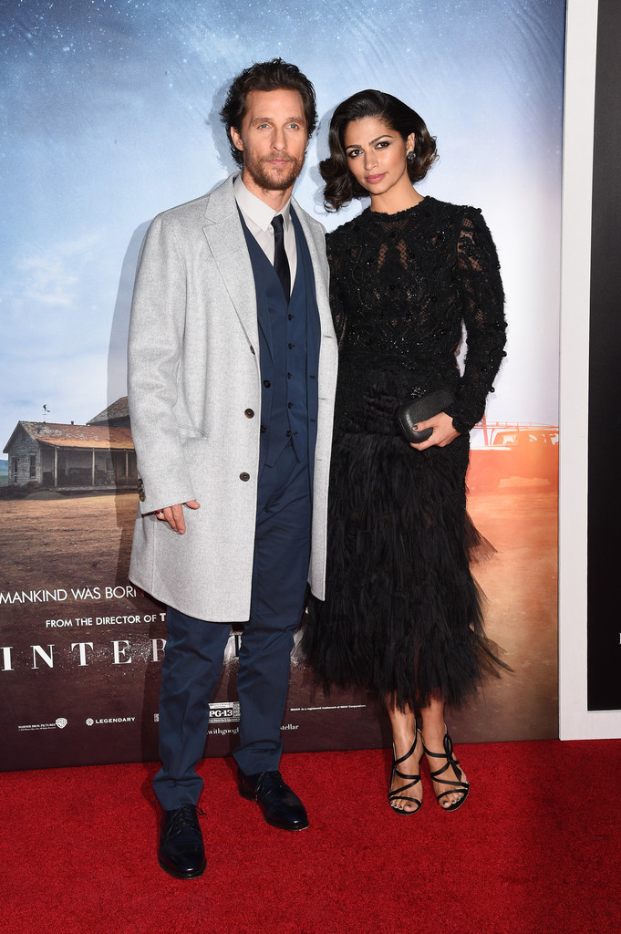 PinAttending the New York City premiere of ‘Interstellar’ on November 3rd, Matthew McConaughey once again hit the red carpet in a tailored look from Dolce & Gabbana. Posing alongside his wife Camila Alves, McConaughey dons a three-piece navy suit with a gray overcoat.