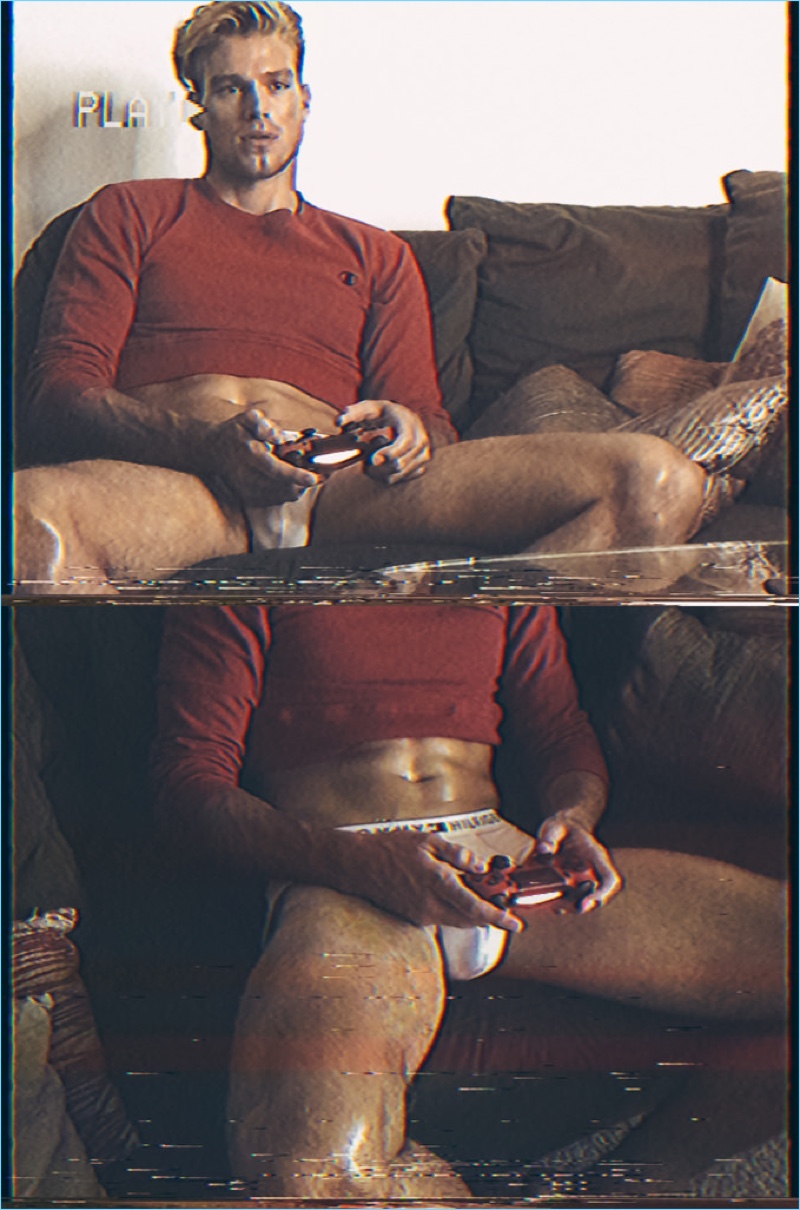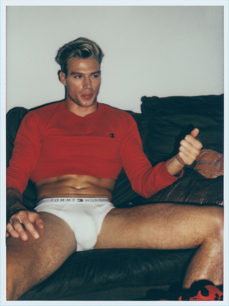 Nicco Torelli outfits Matthew Noszka in a red Champion shirt with Tommy Hilfiger underwear.