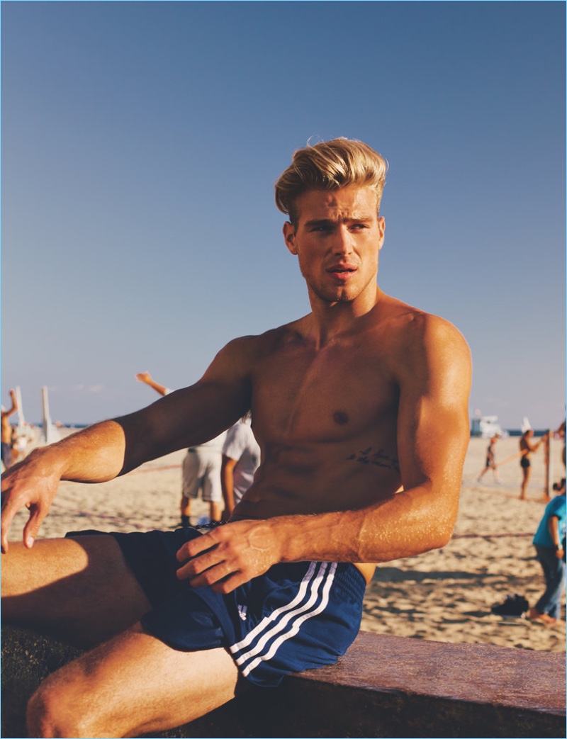 Taking to the beach, Matthew Noszka sports Adidas shorts for Wonderland.