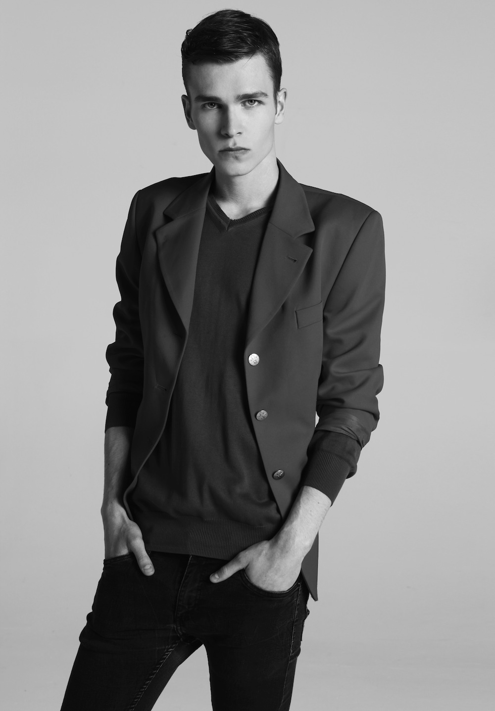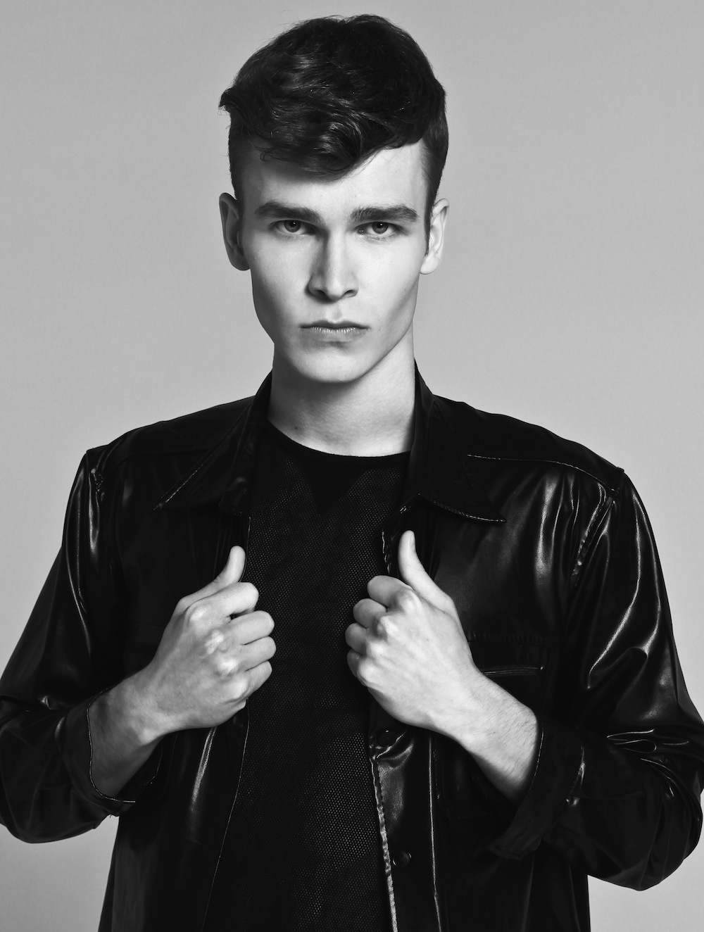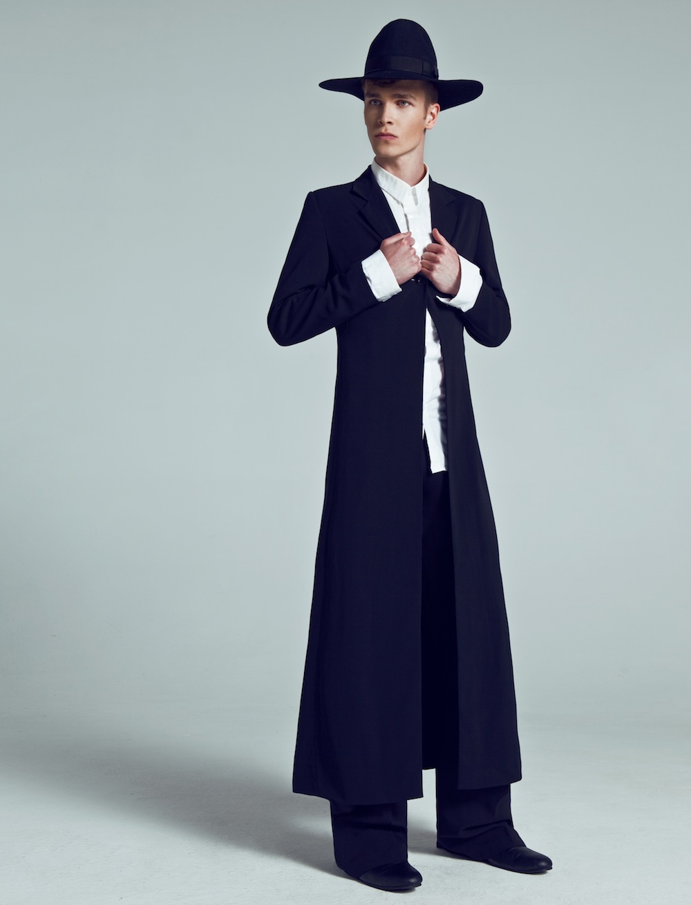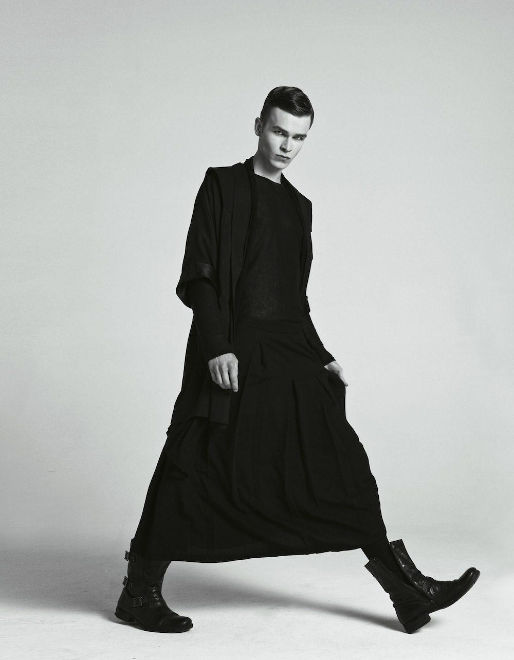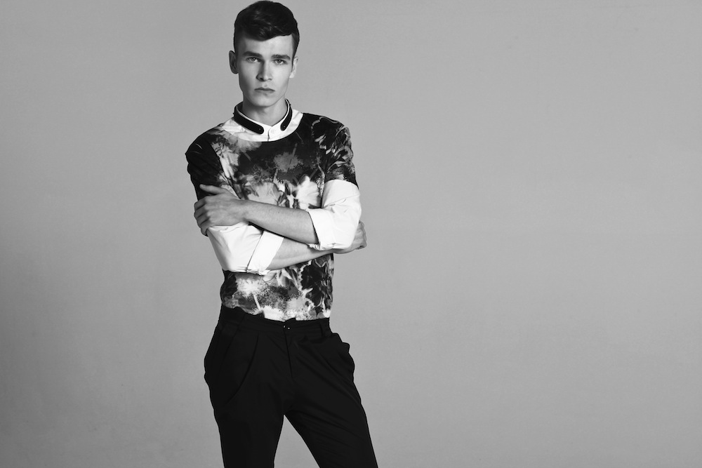 A Session with Matthew–AS Management model Matthew Tomczak appears before the lens of photographer Łukasz Pukowiec, easily striking contemplative poses, clad in a wardrobe that plays with textures, mysterious dark tones and different volumes, assembled by stylist Przemysław Pshemko Paszkowski. / Hair by Mickel Sorenson-Gregorkiewicz. Makeup by Magda Lena Pietraszko.