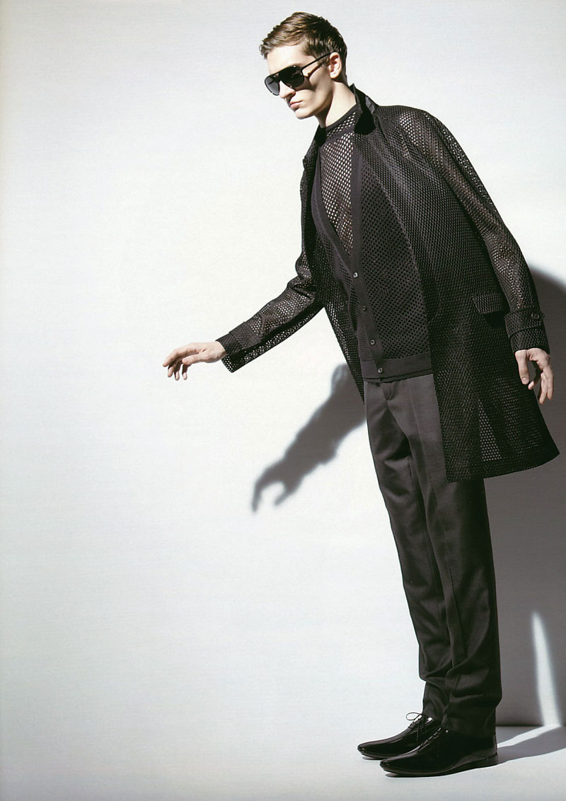 Highlighting Prada’s spring 2010 collection, stylist Tomoki Sukezane outfits Matvey Lykov in one of the season’s most recognizable ranges. Appearing in this month’s issue of Japanese magazine Engine photographed by Kazumi Kurigami, Matvey falls head over heels in love with Miuccia Prada’s sleek cuts and innovative mesh work.