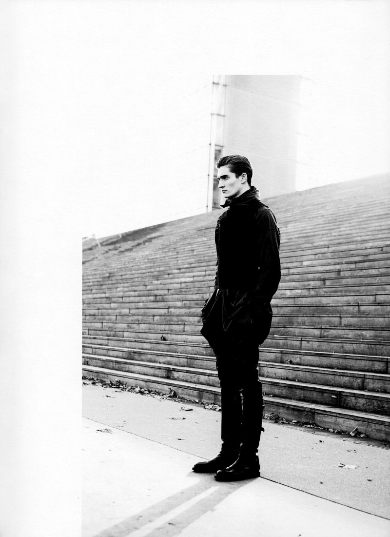 The Black Suprematist–Creators of Dapper Dan magazine, Vassilis Karidis and Nicholas Georgiou, team up once more for the spring issue. Matvey Lykov strikes a chord in a dramatic monochrome wardrobe of deep black featuring the likes of Rick Owens and Ann Demeulemeester.