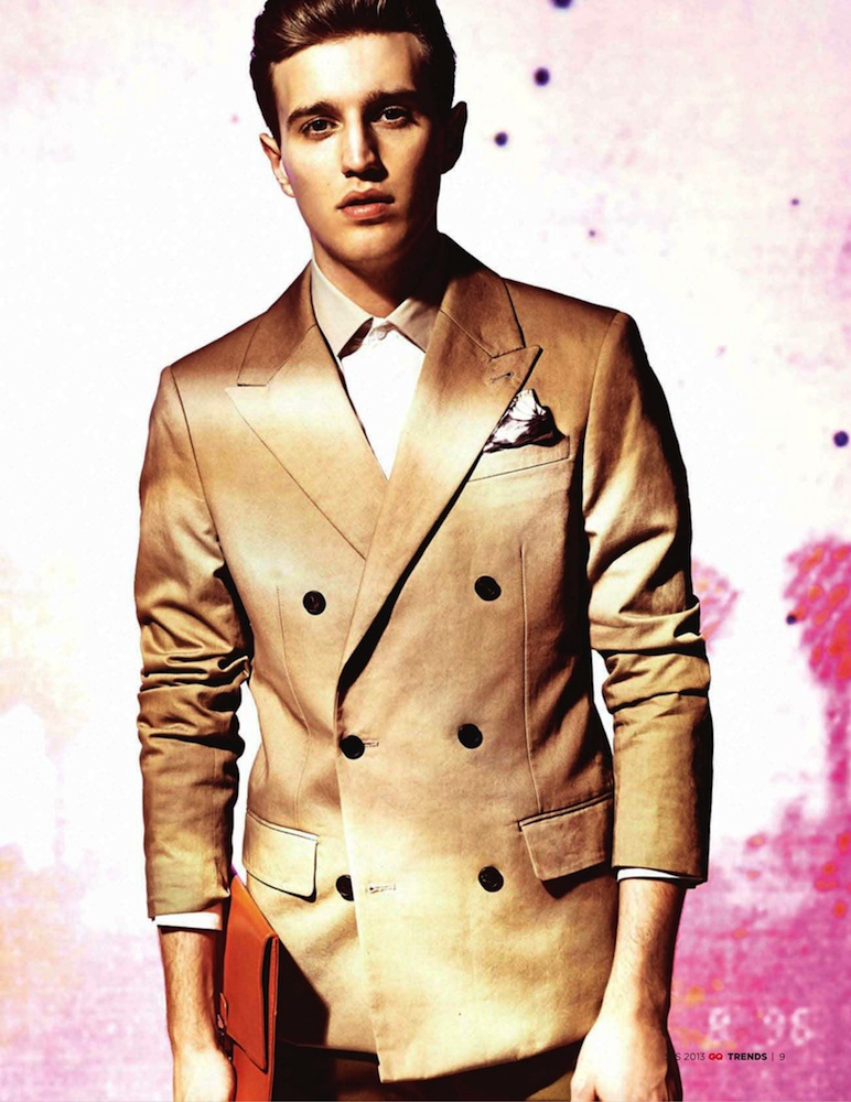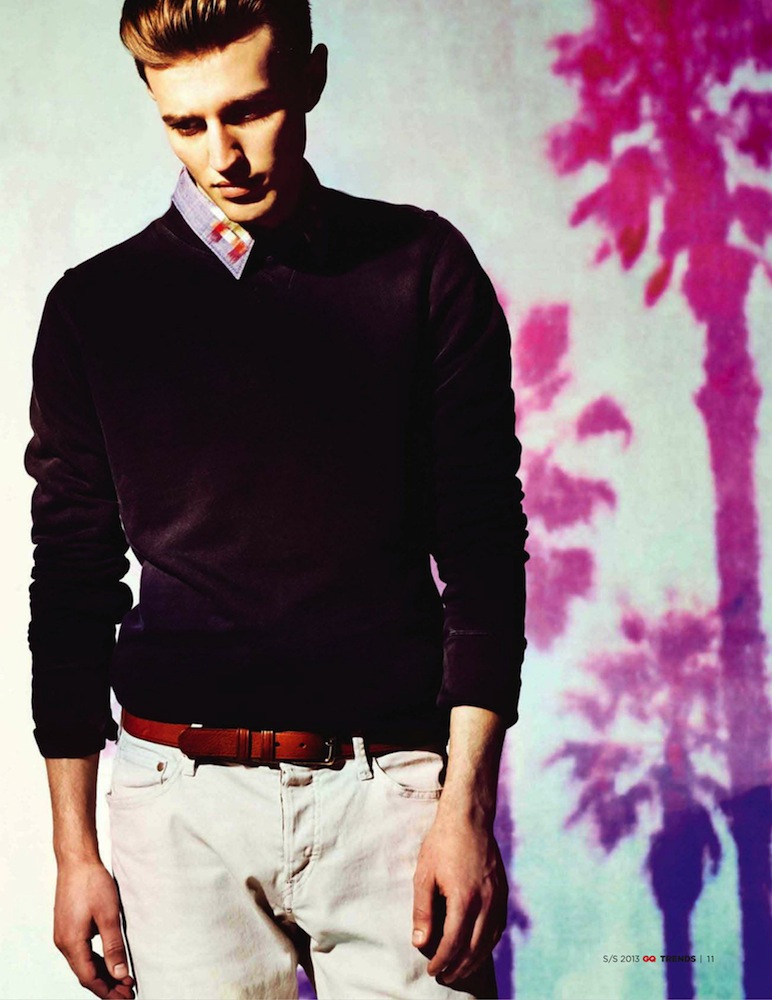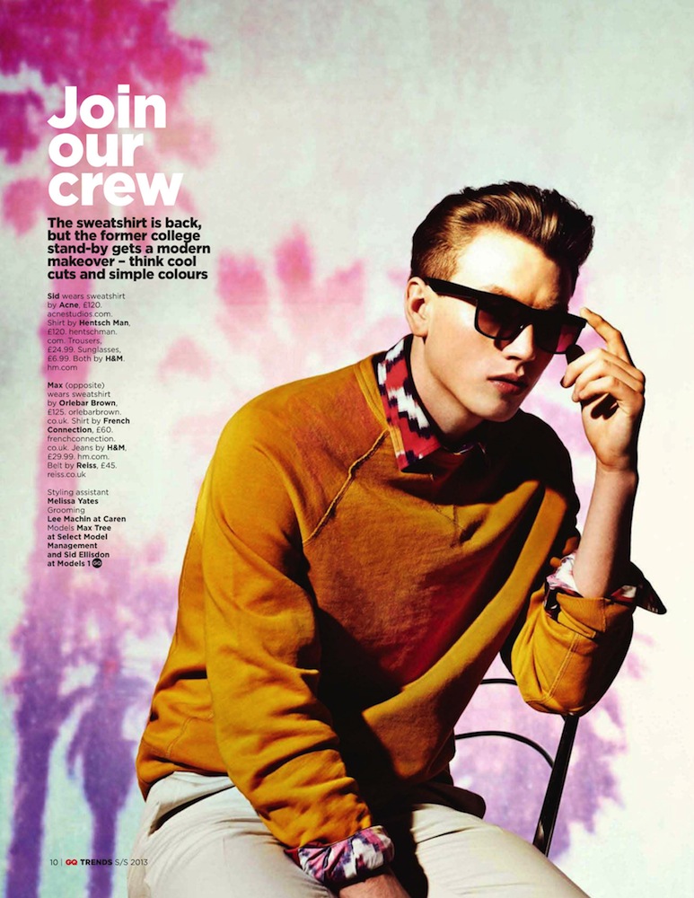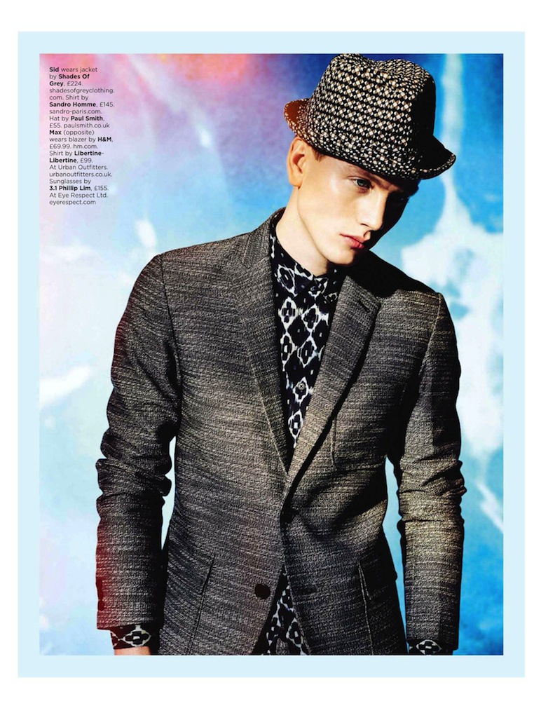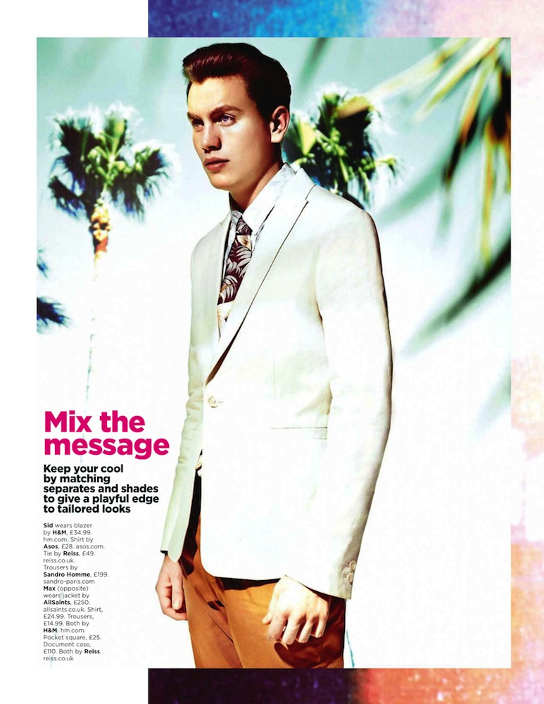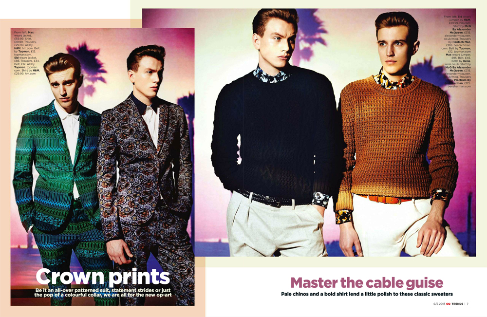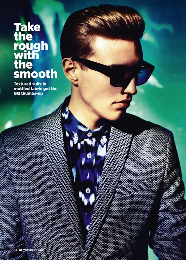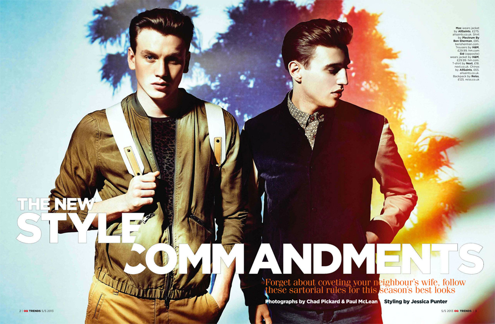 The Rules of Spring Style–Decked out in a wardrobe of stylish spring styles, models Max Tree (Select) and Sid Ellisdon (Models 1) give us a wide preview of some of the biggest trends for the new season. Photographed by Chad Pickard and Paul McLean for the April 2013 issue of GQ UK, the pair are styled by Jessica Punter in textured suits, digital prints, matching separates and modern sweatshirts, creating a fashionable and contemporary wardrobe for the new season. / Styling assistance by Melissa Yates. Grooming by Lee Machin.
