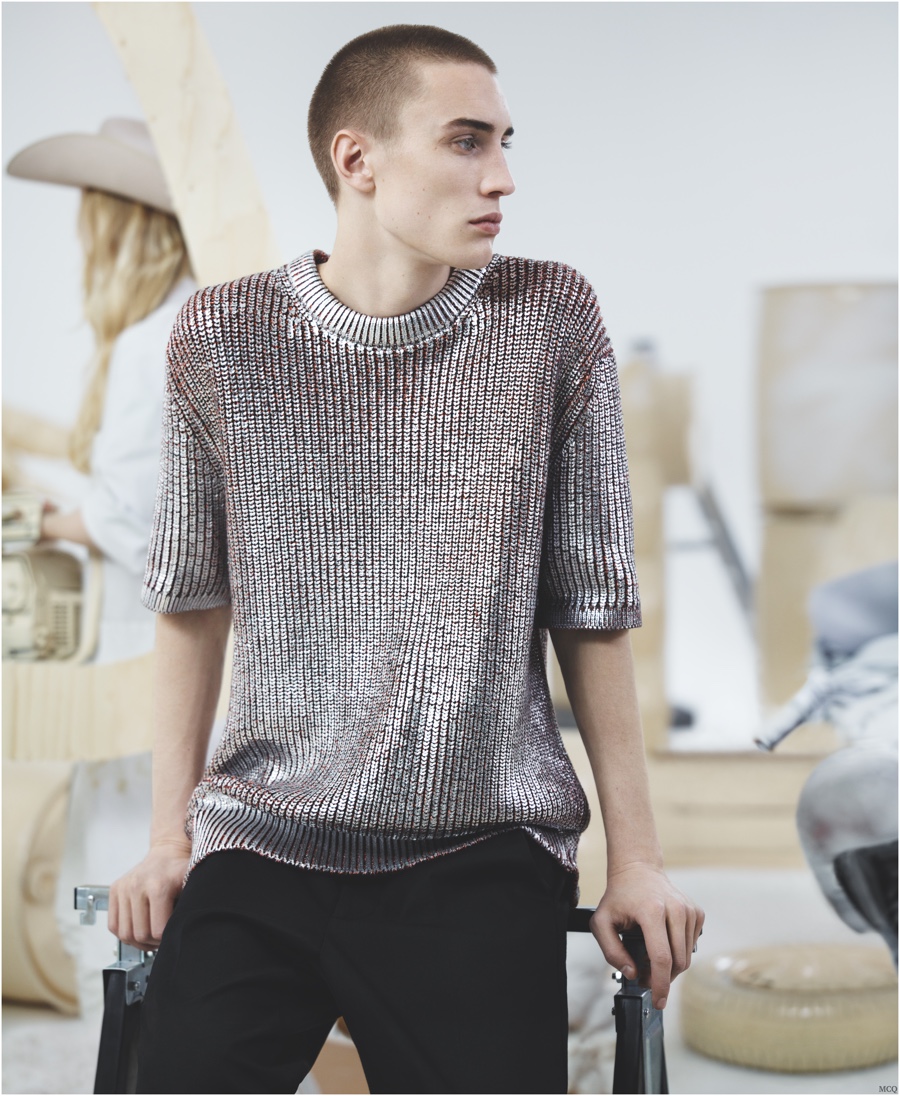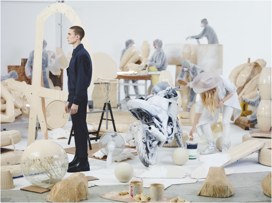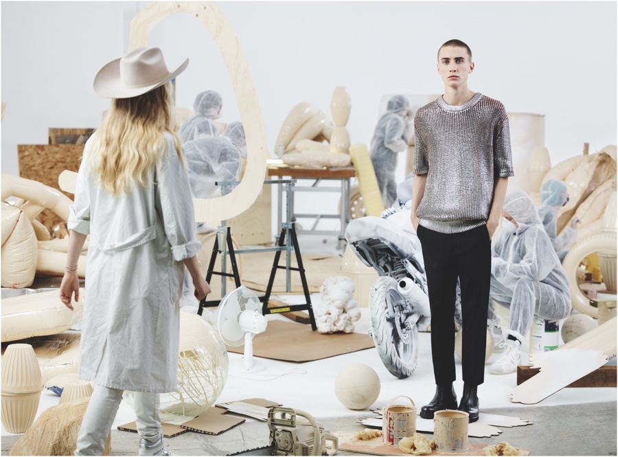McQ by Alexander McQueen collaborates with artist Ophelia Finke for a new spring-summer 2015 campaign, captured by photographer Laurence Ellis. Outfitted by stylist Karen Langley, the star this season is none other than Michael Sharp. Sharp sports McQ’s rebellious, youthful lineup as he poses amongst Finke’s latest art installation.