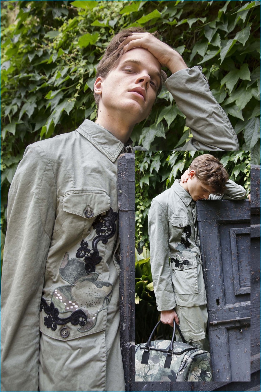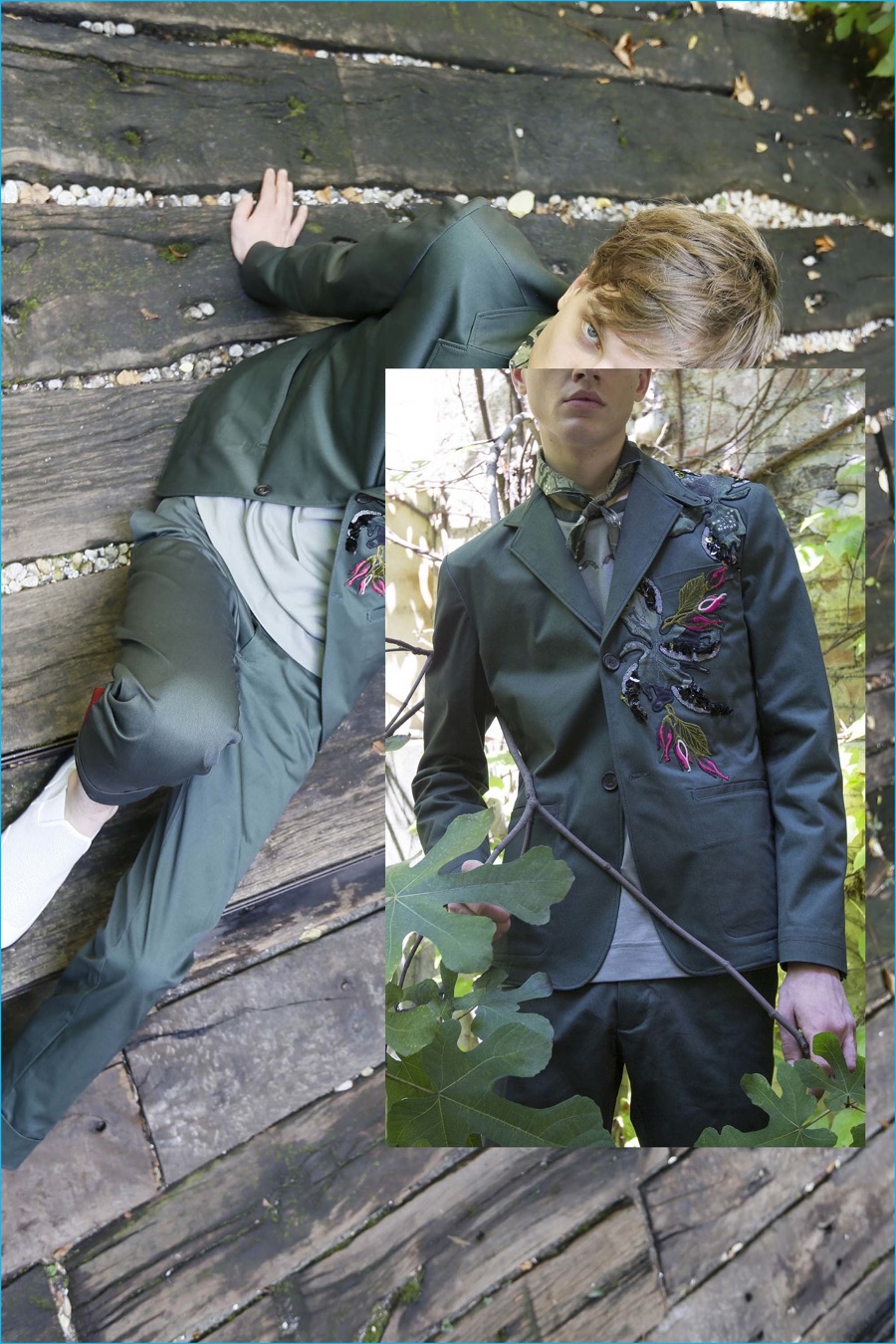 Pictured against a rustic set and among foliage, Reid showcases Marras’ latest designs which take in travel destinations, ranging from the French Riviera to Amsterdam. Creating a global tapestry, the collection boasts intricate prints and embellishments that decorate overshirts, casual tees, straight-cut suits and sweater sets. Rounding out the season, Marras also collaborated with Italian artist Franko B on a series of t-shirts, adorned with illustrations.