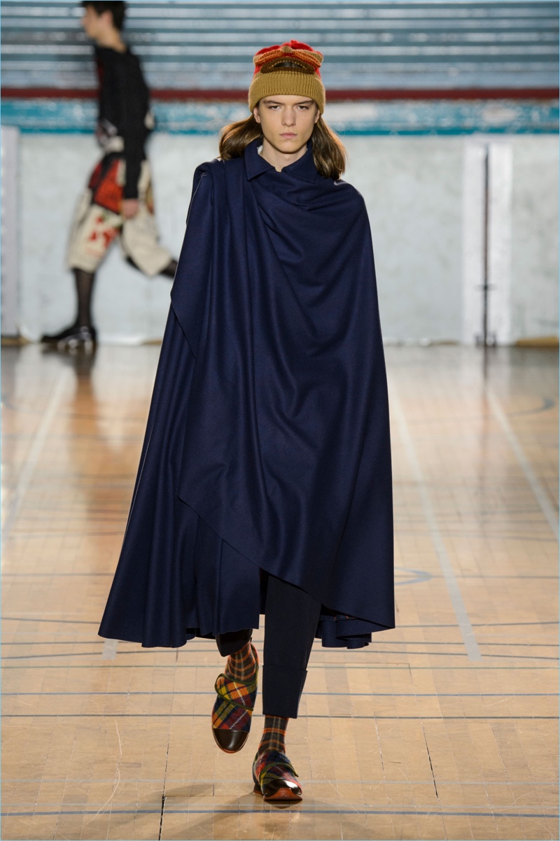 Marking its return to Great Britain after shows in Milan, Vivienne Westwood presented its fall-winter 2017 men’s collection during London Fashion Week Men’s. Androgyny continues to be a key signature of the Vivienne Westwood man. Oversized capes, tailored coats, charming waistcoats, and tops with plunging necklines contribute to the outing. The season’s color palette consists of earthy hues and dark numbers with a splash of rich jewel tones.