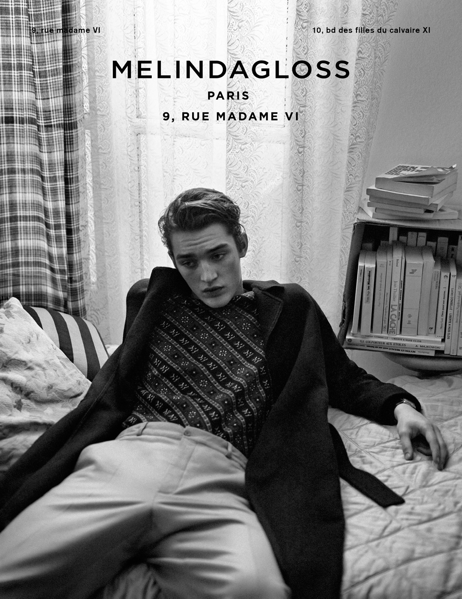Melinda Gloss retreats indoors for its fall-winter 2015 advertising campaign. Photographed by Lachlan Bailey, the black & white outing features model Otto Lotz. Exuding a boyish charm, Otto is captured in printed tops and oversized outerwear, highlighting relaxed tailoring.