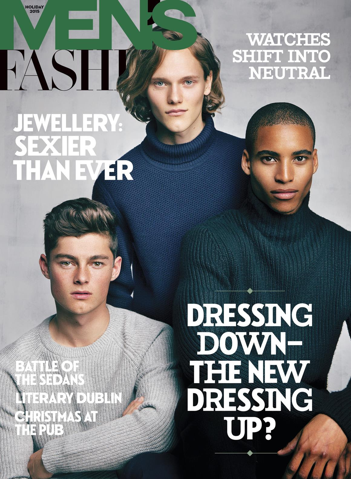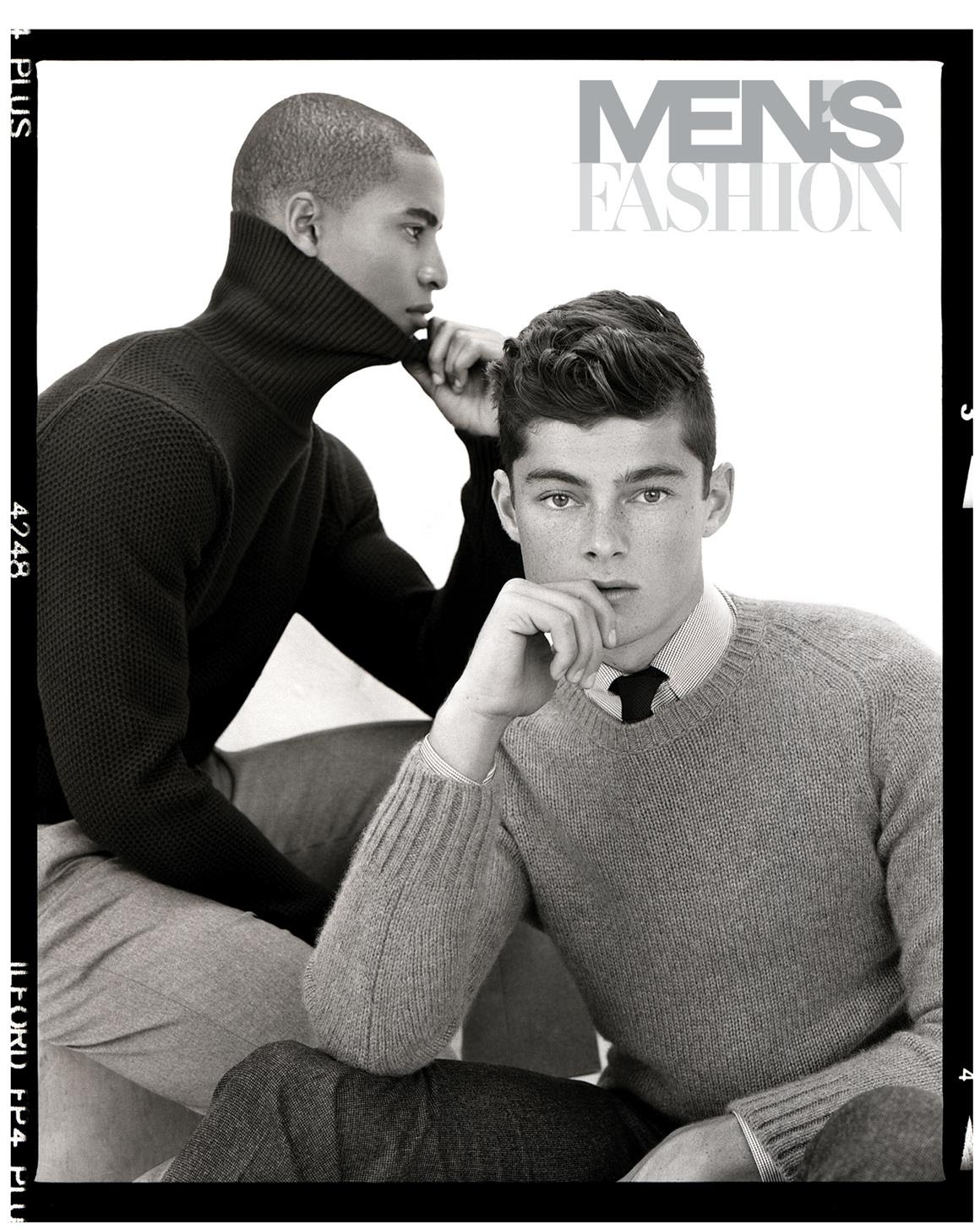 Models Quinn, Ryan Keating and Malik Lindo grace the holiday 2015 cover of Men’s Fashion. The trio (left to right) wears sweater, $250, Michael Kors, sweater, $130, Tommy Hilfiger and sweater, $1,805, Berluti.