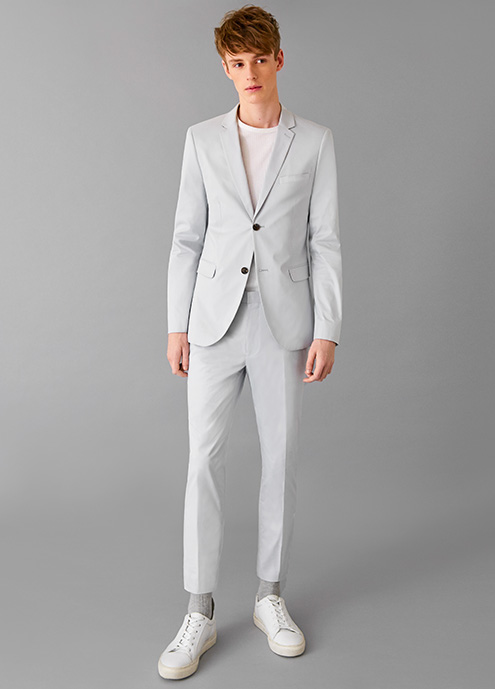 Minimal Tailoring: The trim suit is a monochromatic vision this season in calming, serene neutrals such as tan and light grey. Fully embrace the minimal trend by wearing your suit with a simple tee.