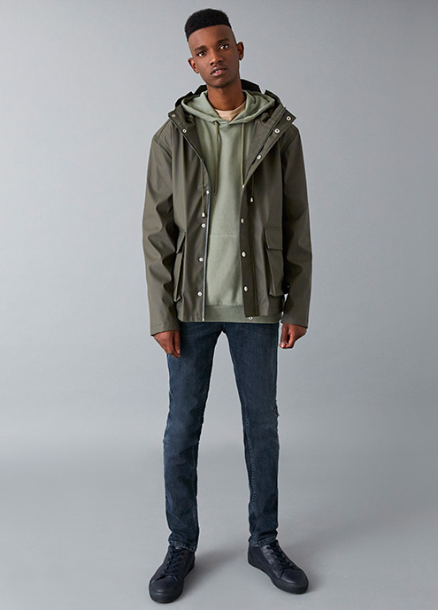 Denim Days: Timeless staples such as the parka are updated with a dark distressed denim wash. The essential would look great with a pair of trendy slim-cut joggers.