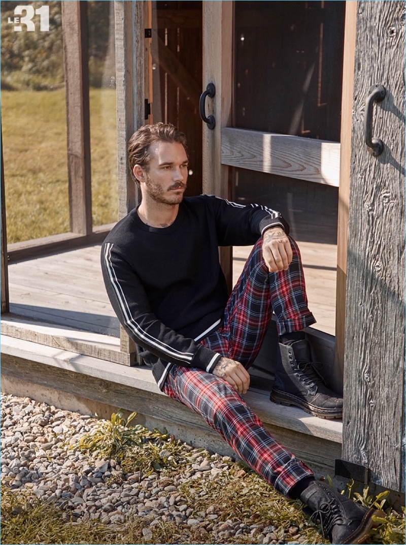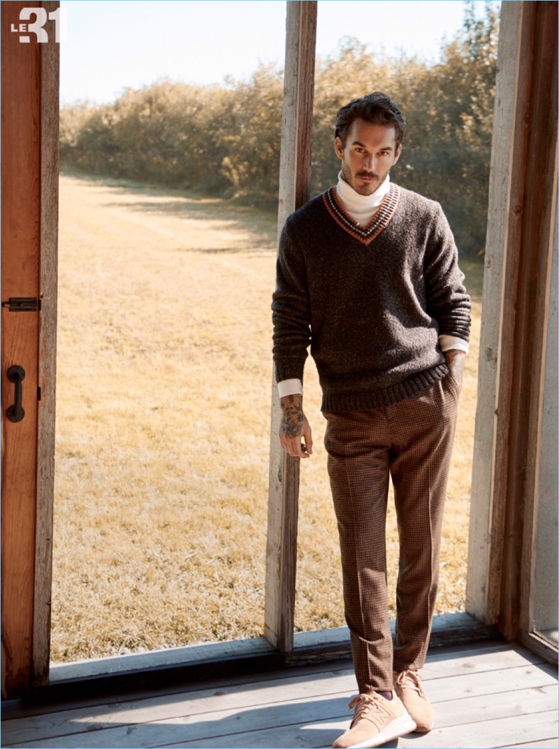 PinConnecting with Simons, David Alexander Flinn models a LE 31 Ikat jacquard cardigan, flannel shirt, and cargo pants.PinEmbracing preppy style, David Alexander Flinn dons a LE 31 retro varsity sweater, turtleneck sweater, and gingham check trousers.