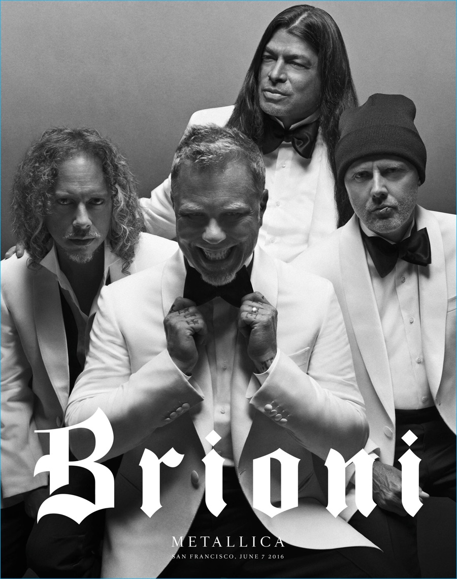 Metallica goes formal in white dinner jackets and black bow-ties for Brioni's new advertising campaign.Pin